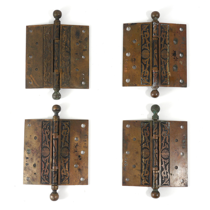 4 PIECE 1890'S BRONZE ARCHITECTURAL HINGES: Cast bronze hinges with stylized foliate motifs. Marked 5 X 5 45. Overall each measures 7 1/4'' h. x 3''.