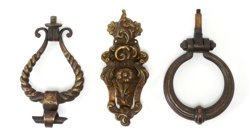 3 VICTORIAN BRONZE DOOR KNOCKERS: 3 total, assorted shapes and sizes. Large ring measures 4 3/4'' dia. overall.