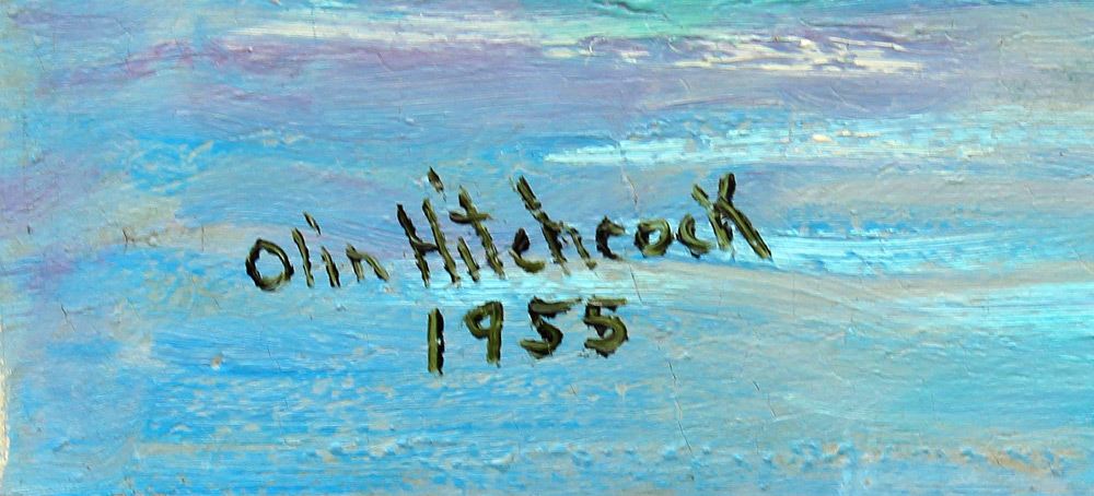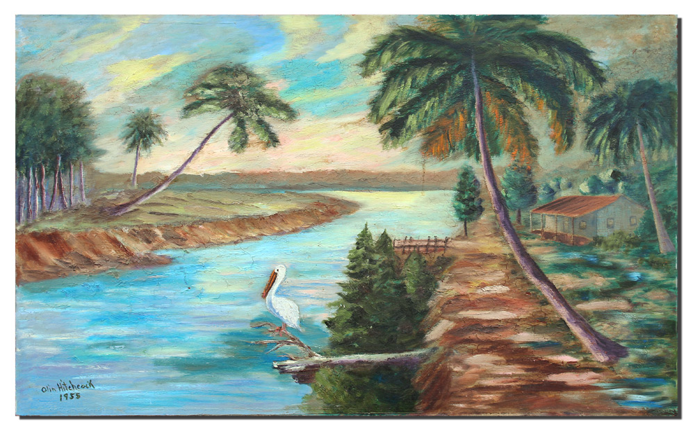 HITCHCOCK, Olin, (American, 20th Century): Florida River Landscape with Pelican, Oil/Board, 24'' x 39 1/4'', signed lower left, dated 1955, unframed.