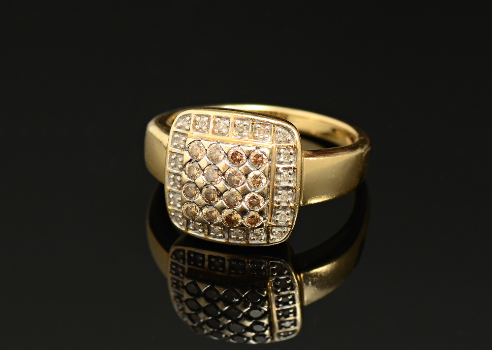 BROWN AND WHITE DIAMOND RING: 14k gold ring with the center having a square of 16 brown diamonds framed by white diamonds, all totaling approx. .46 Ct. Size 8. Weight 6.3