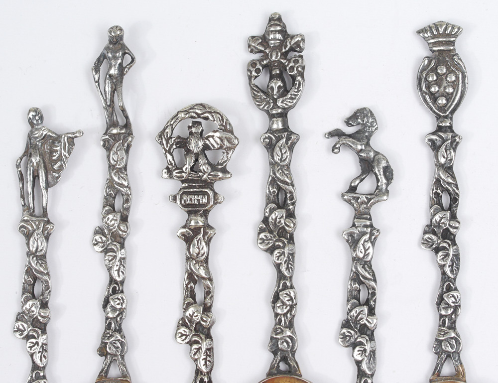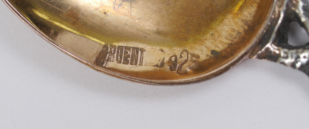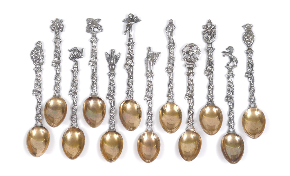 STERLING SILVER SOUVENIR SPOONS IN PRESENTATION BOX: Collection of 12 spoons with assorted finials, vermeil bowls, each marked 925 Argentine, 3 3/4'' long. Box measures 12 1/4'' x 6 1/2'' x 1 1/4''. Spoons total approx. 3.1 troy oz.