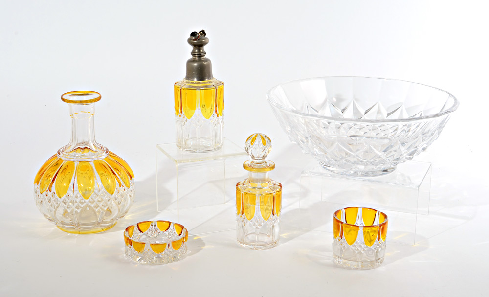 6 PIECE COLLECTION VAL ST. LAMBERT: 6 pieces total to include 1) Center bowl, 3 3/4'' h. x 10'' dia. 2-6) 5 piece dresser set to include decanter (missing stopper, 7'' h.) ring dish, small cup (marked Val. St. Lambert, Belgique), perfume with stopper, perfume with atomizer mount.