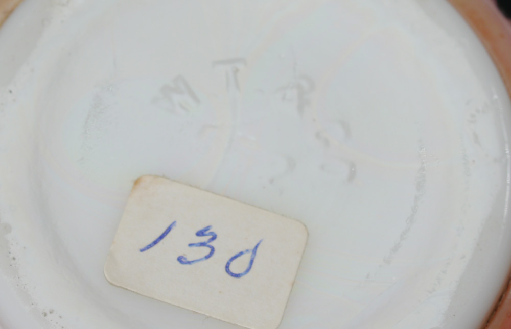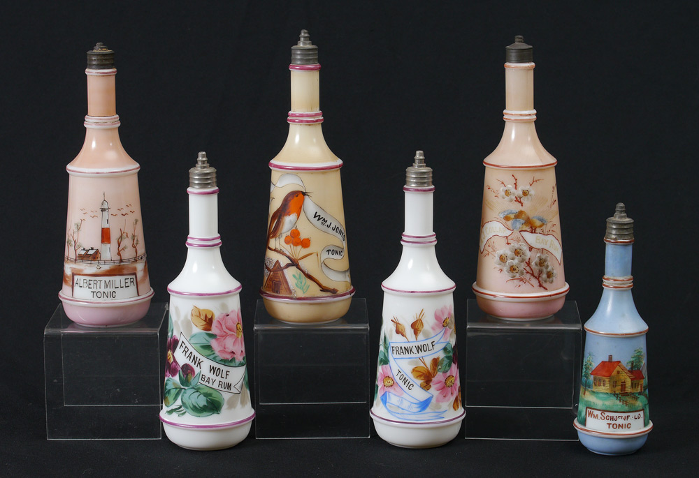 GROUP OF 6 MILK GLASS BARBER BOTTLES: Hand painted decoration, personalized with names. Tonic and Bay Rum included. Measures approx. 8 1/2''-10''. From the William Merner Collection.
