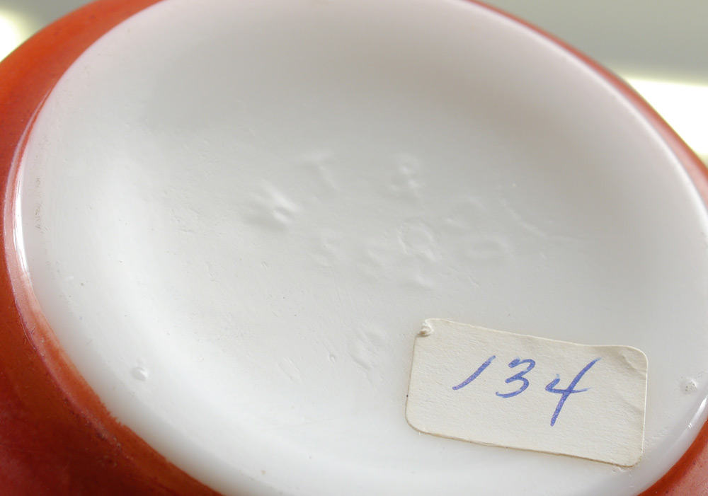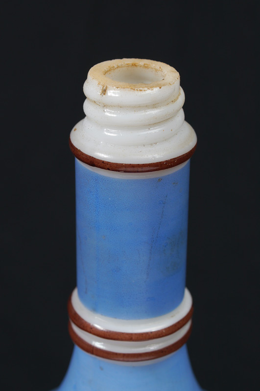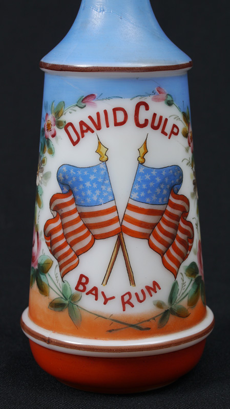 MILK GLASS FLAG DECORATED BARBER BOTTLE: Hand painted decoration, personalized with name. Measures approx. 10''. From the William Merner Collection.