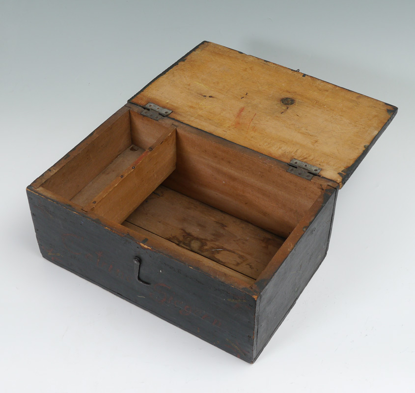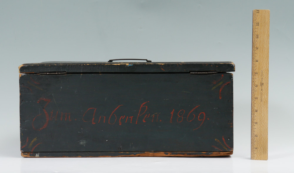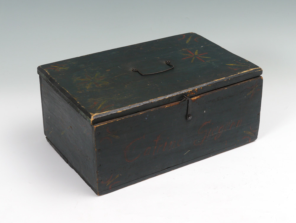 1869 DATED PENNSYLVANIA DUTCH PAINTED BOX: Paint decorated with stylized flowers, name on front Catrine Giegern, writing on back and dated 1869. Hinged lid with handle, interior with compartment. Overall measures 7 3/4'' h. x 17 3/4'' x 11 1/4''.