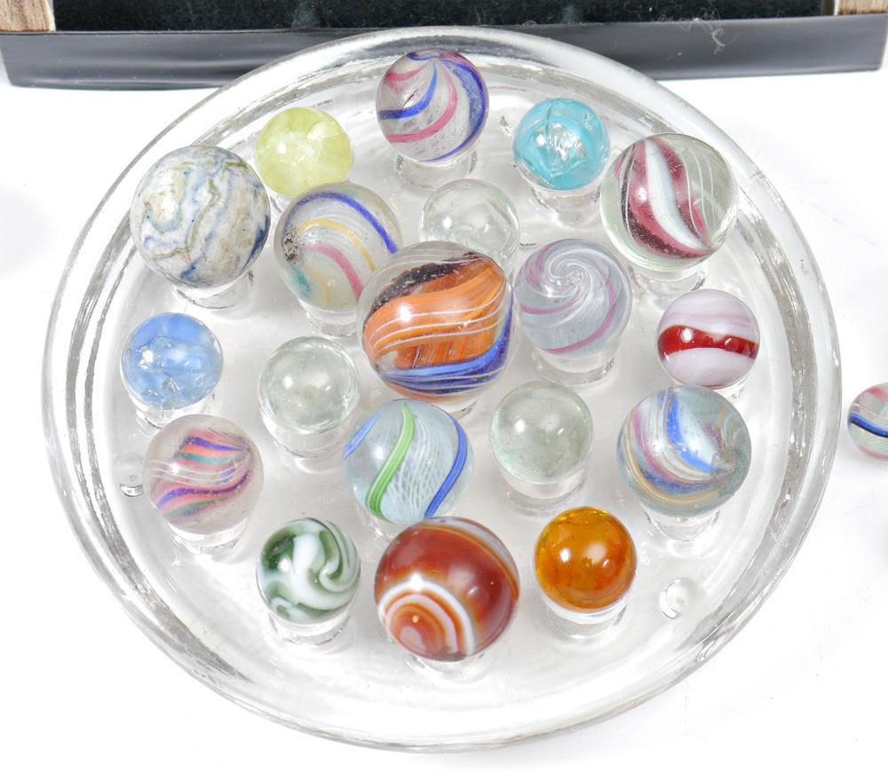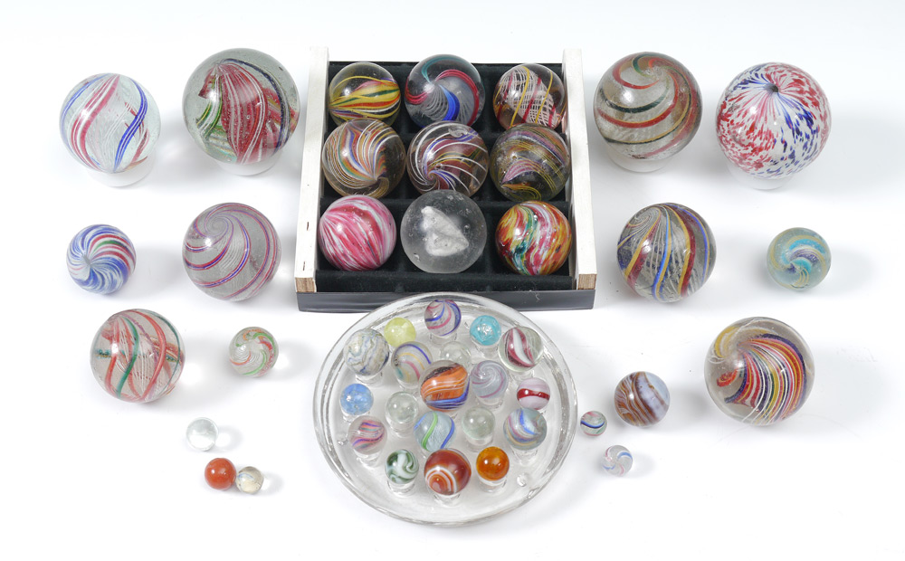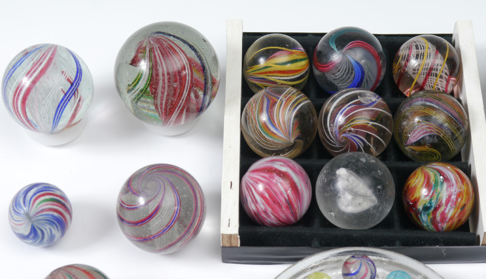 COLLECTION OF VINTAGE MARBLES: 31 assorted marbles to include latticino, swirls, coreless swirl, ribbons and more. Sizes from 3/4'' to 2 1/4''.
