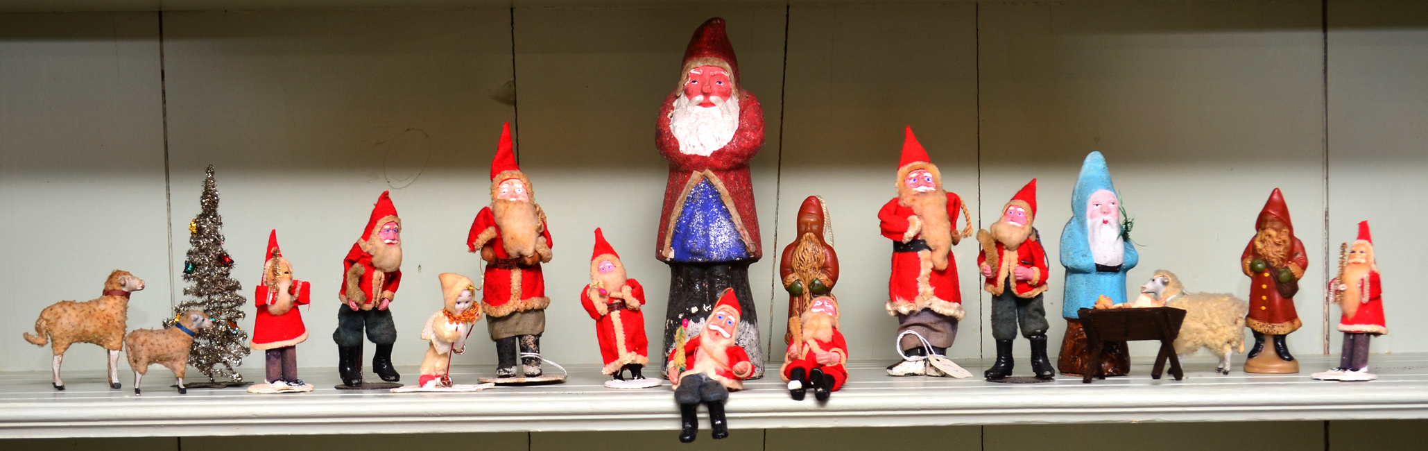 14 VINTAGE SANTA CLAUS FIGURES: Straight from the estate! The largest being the 9 1/2'' paper mache and gesso hollow body Santa, his underside stamped ''Germany''. There are 10 Santas in felt suits, with sacks, sprigs and shelf sitters, 4-7'' The 3 wax Santas are 5'' and 2 1/2''. Sold together with the 6'' German wire Christmas tree, 3 lambs and a creche.
