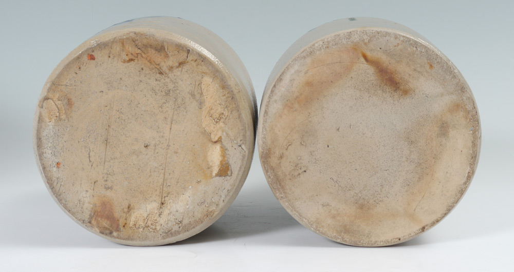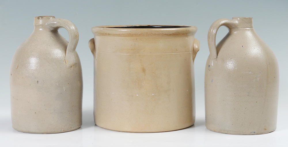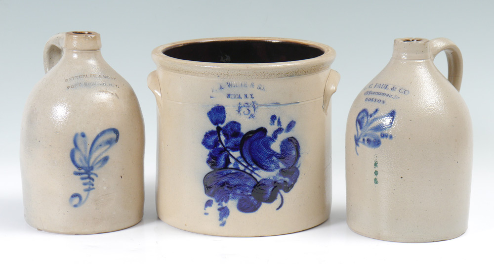 3 PIECE BLUE DECORATED STONEWARE CROCK & JUGS: 3 pieces total to include 1) 3 gallon crock, N. A. White & Son, Utica, N. Y., floral decoration. 10 3/4'' h. x 12'' dia. 2) 1 gallon jug, L. C. Paul & Co., 89 Blackstone St., Boston, floral decoration. 11 1/2'' h. x 7 1/2''. 3) 1 gallon jug, Satterlee & Mory, Fort Edward, N. Y., floral decoration. 11 1/2'' h. x 7 1/4''.