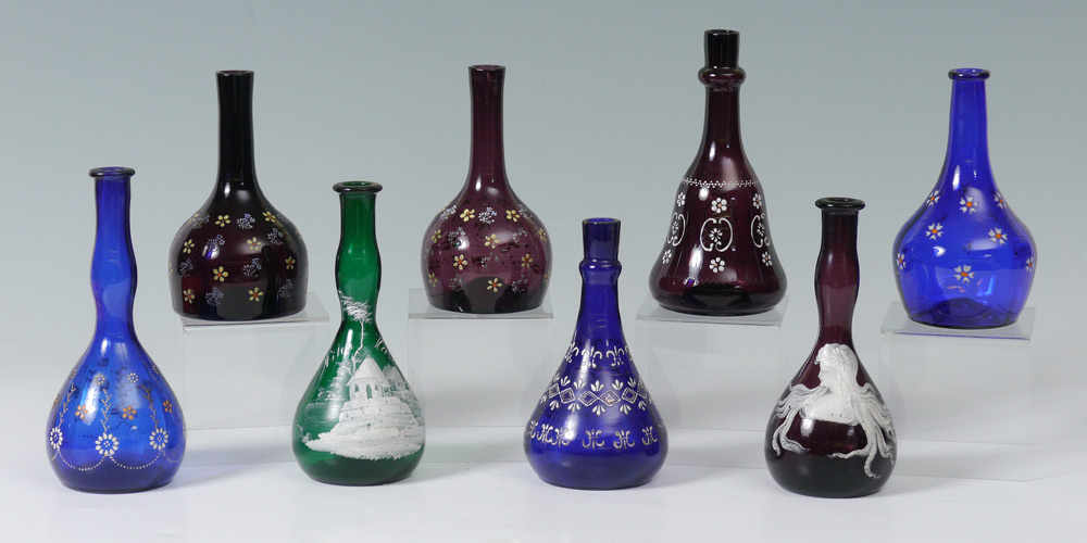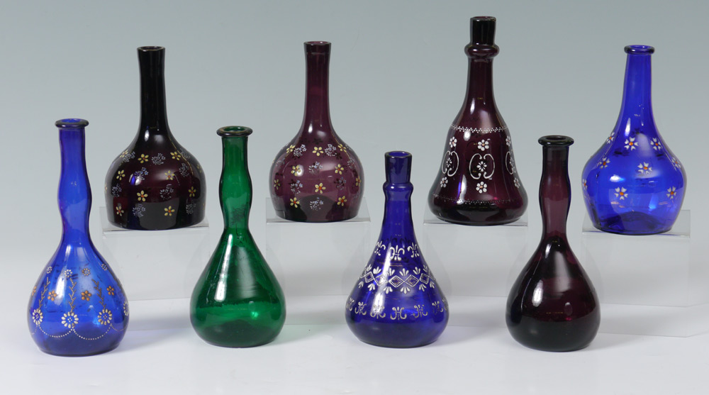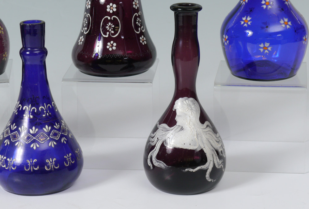 8 ENAMELED GLASS BARBER BOTTLES: Cobalt blue, purple and green glass with enameled decoration including Art Nouveau maiden and Witch Hazel. Measures 7''-8'' tall. From the William Merner Collection.