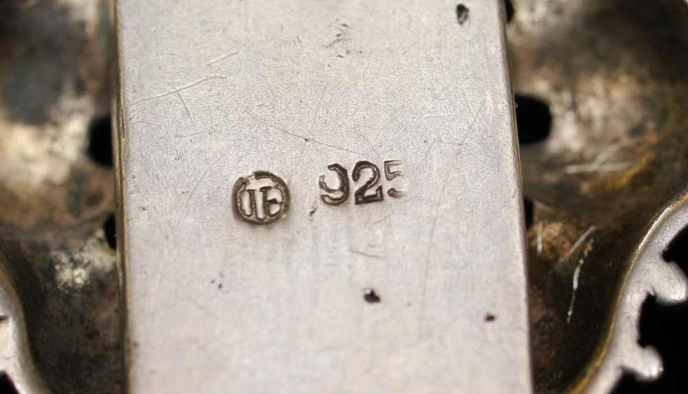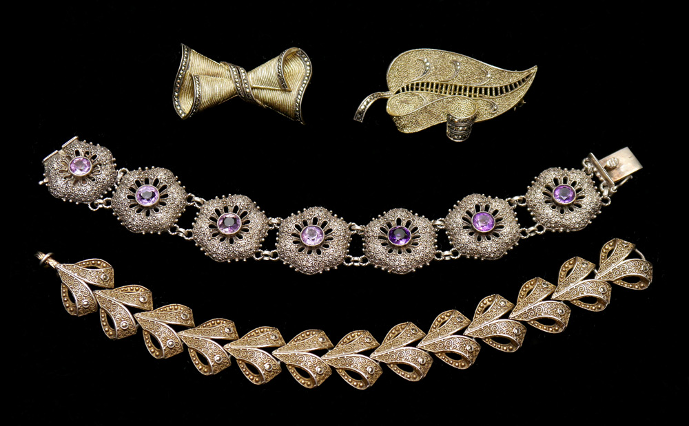 SIGNED THEODORE FAHRNER STERLING JEWELRY: 4 pieces of art jewelry to include 2 bracelets (7'' )and 2 pins. Late 19th - early 20th century. All pieces are signed. Approx. 24.2 troy oz.