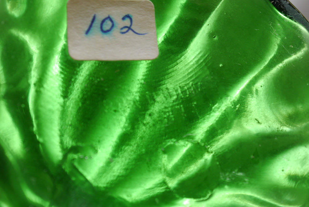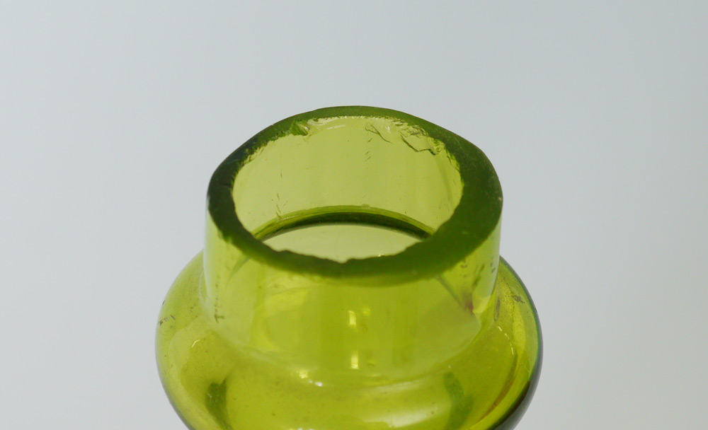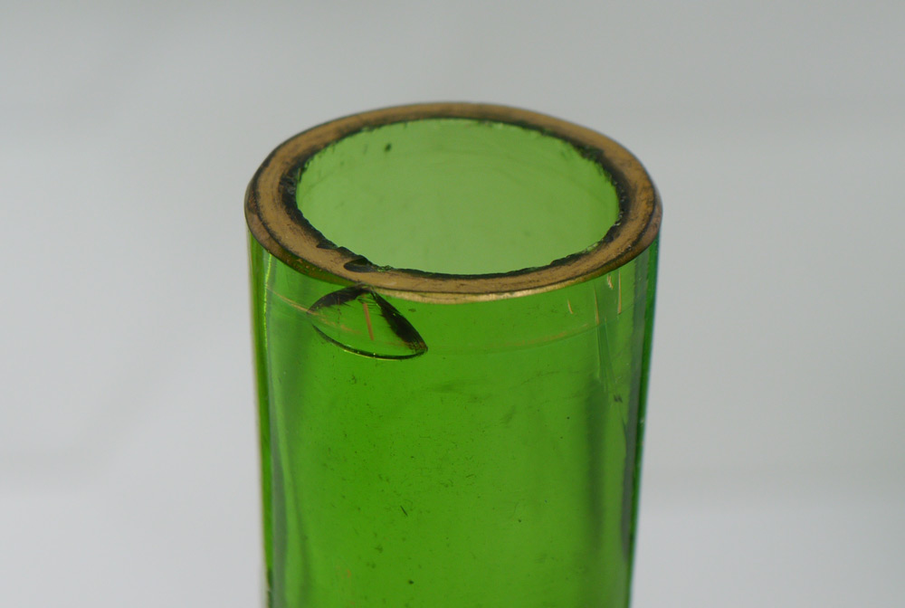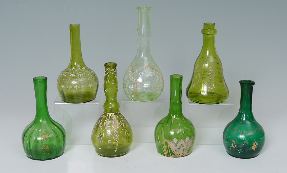 A GROUP OF 6 ENAMELED GLASS BARBER BOTTLES: In shades of green. Measures approx. 6 1/2'' - 8'' tall. From the William Merner Collection.