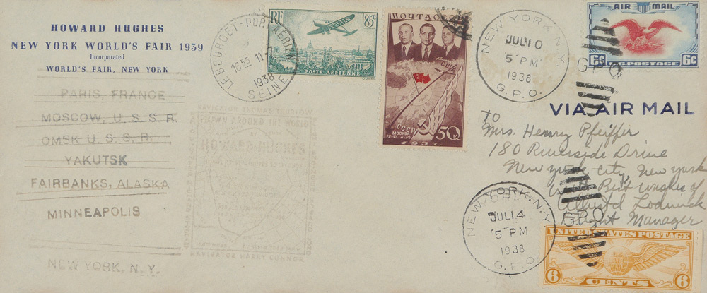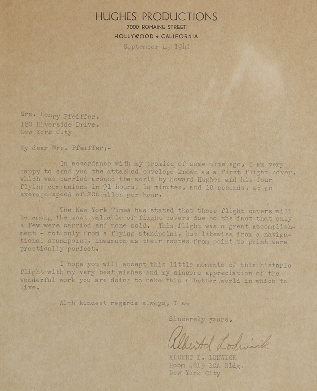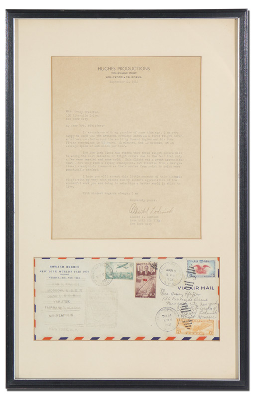 HOWARD HUGHES ROUND THE WORLD FLIGHT ENVELOPE: AAMC #1307, Aerophilately, 1938 Howard Hughes Record Flight Around The World. Envelope and letter both signed by Albert Lodwick, Flight Manager. Envelope with cancelled stamps from each stop during the record setting 91 hour, 14 minute, 10 second flight around the world. Framed under glass, 18 3/8'' x 12 1/4''.