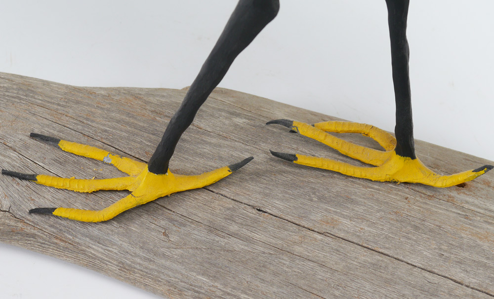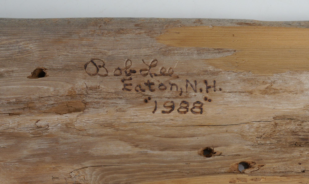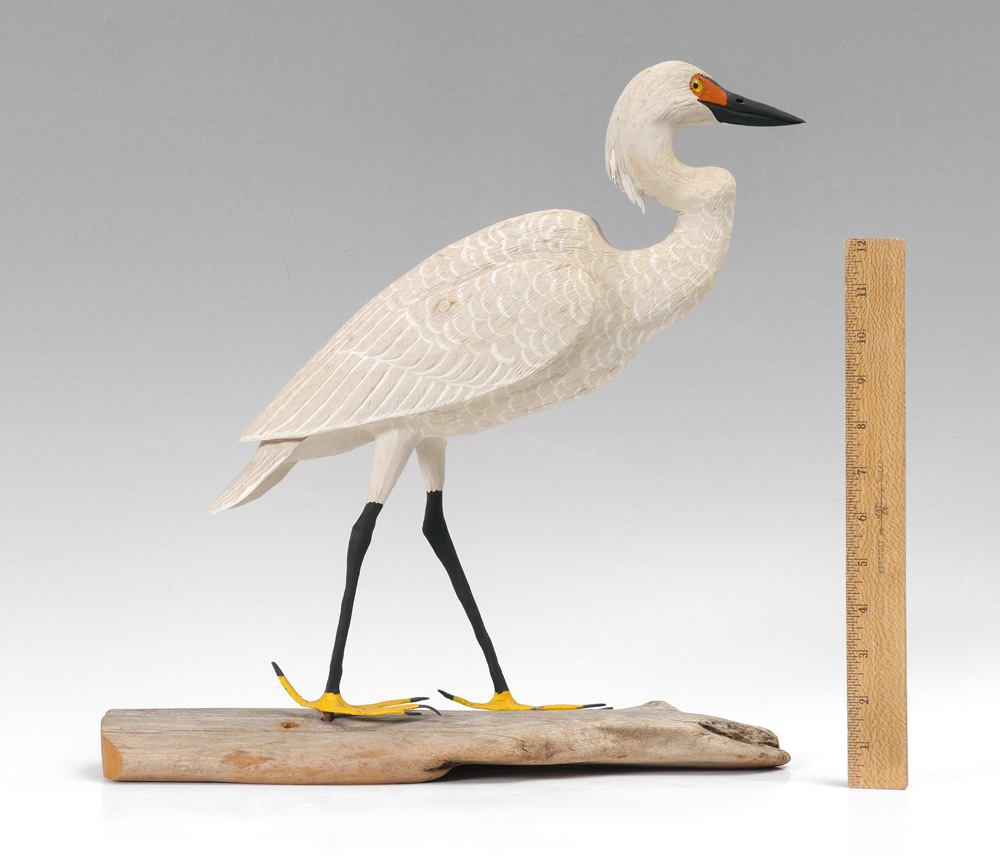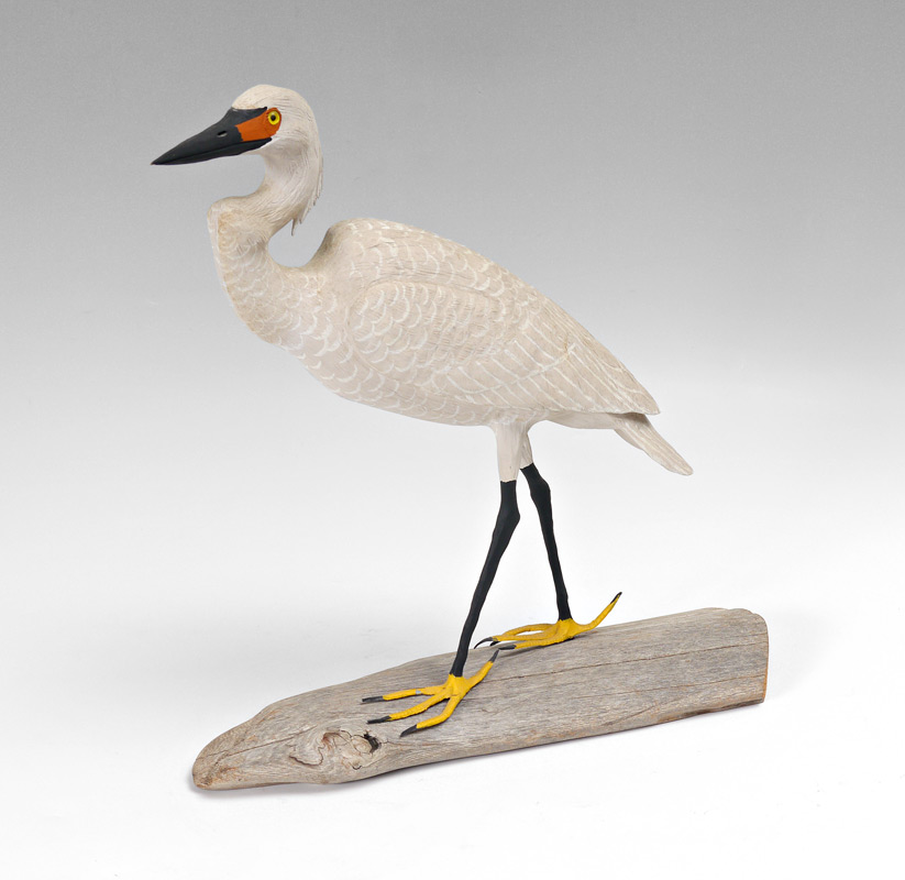 BOB LEE CARVED WOOD SNOWY EGRET: Nicely detailed carving of a snowy egret with driftwood plank base. Signed on base Bob Lee, Eaton, N. H., 1988. Overall measures 16 1/4'' h. x 15 3/4'' x 5''.