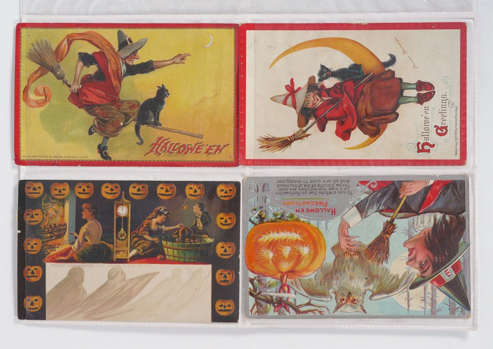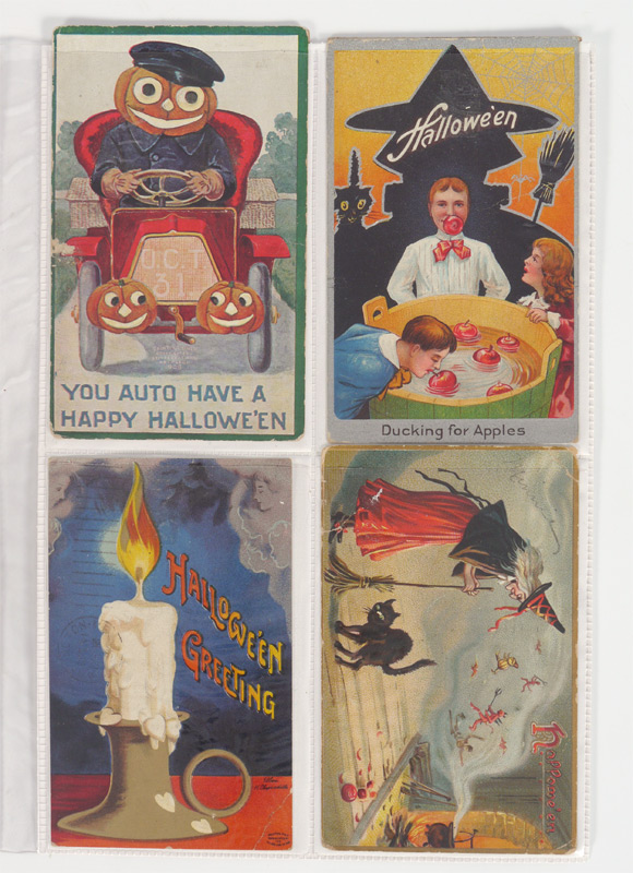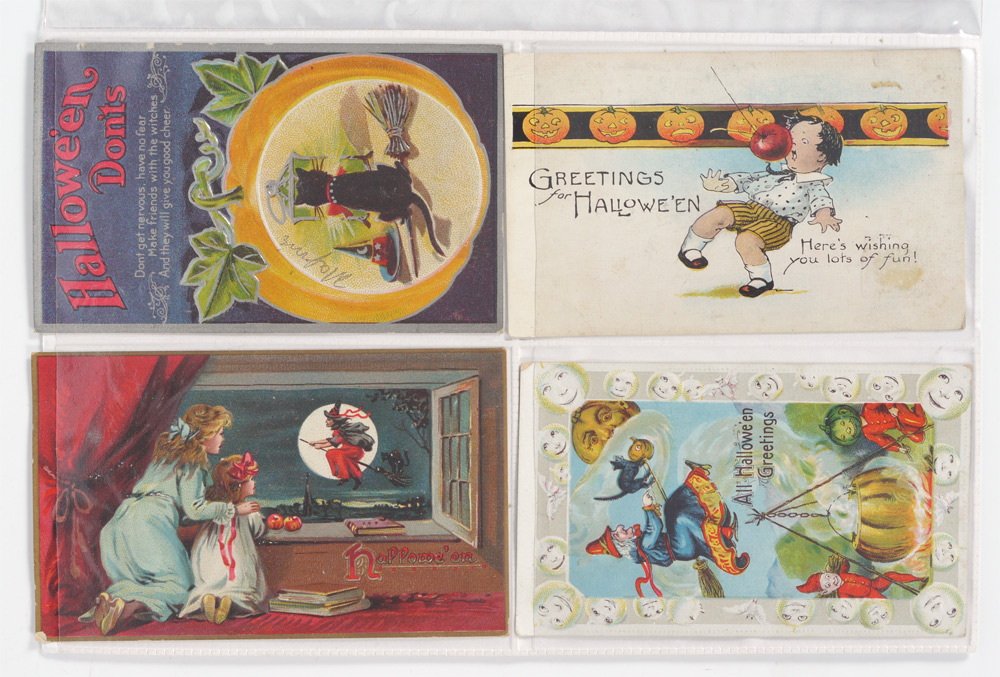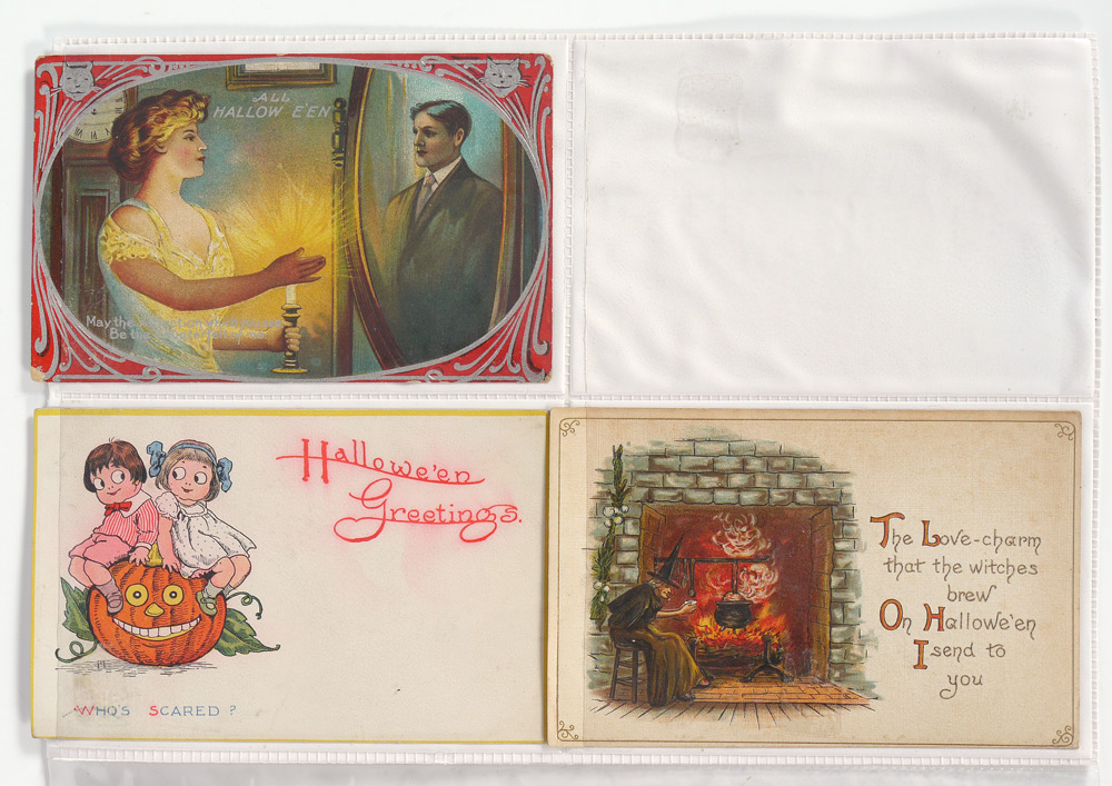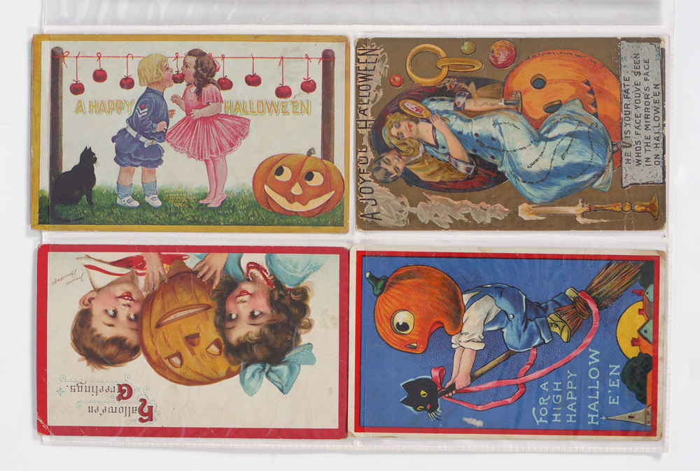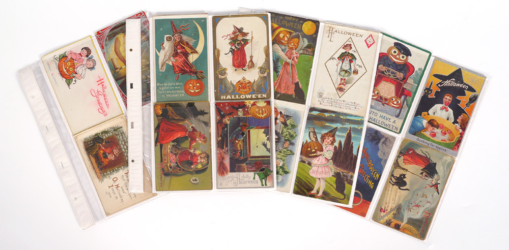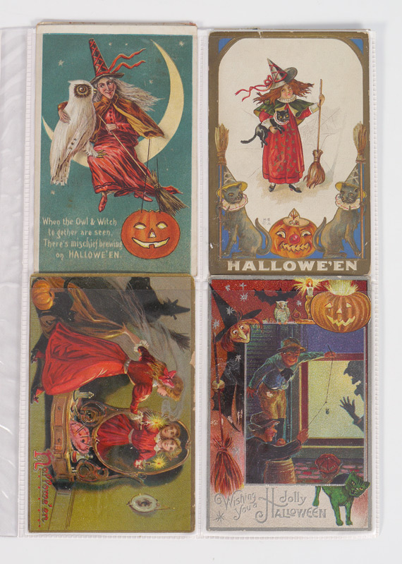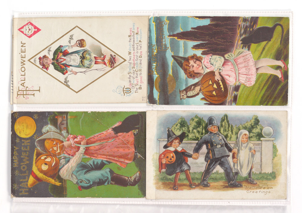 COLLECTION OF 27 HALLOWEEN POSTCARDS: Early 20th century from various printers and artists, several are embossed. Depictions of children, witches, owls, ghosts, jack-o-lanterns and more. In 4 sleeves.