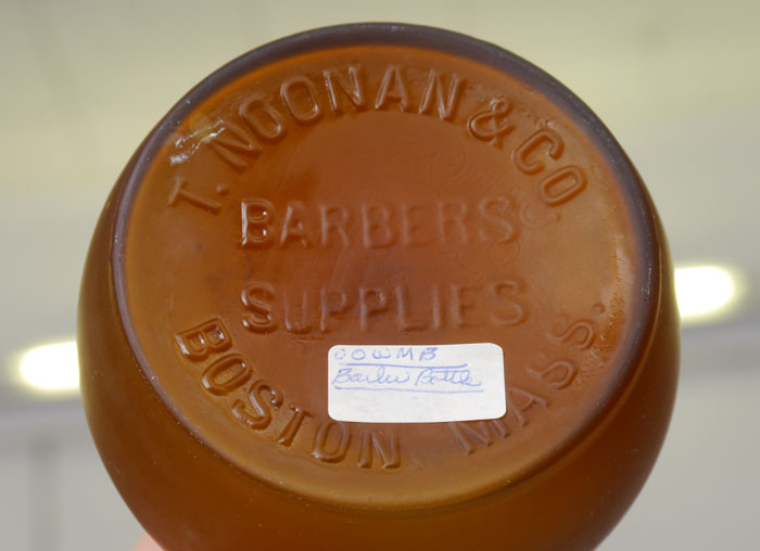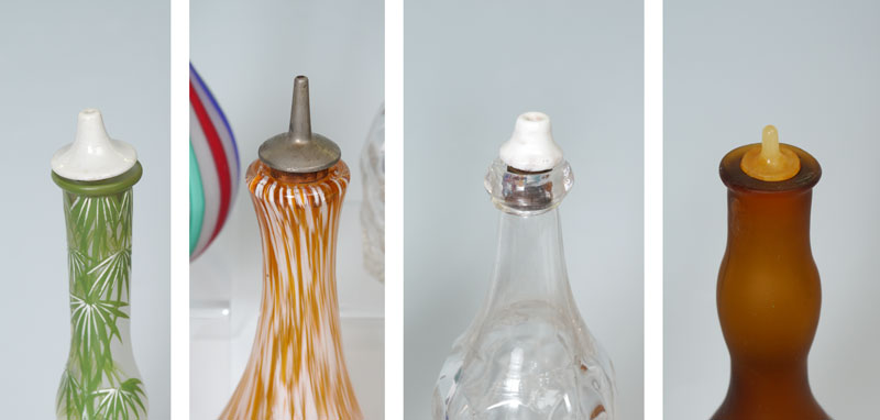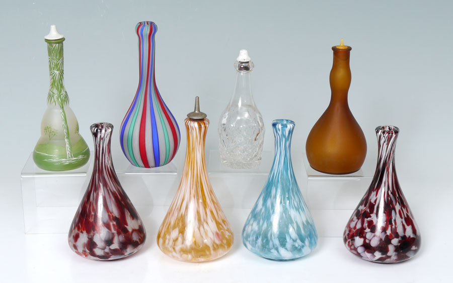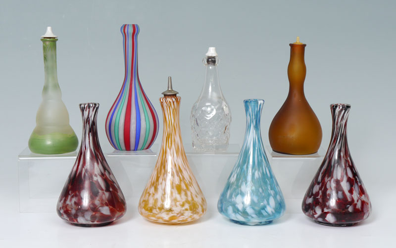 A GROUP OF 8 ART GLASS BARBER BOTTLES: To include Latticino, mottled, and a hand painted landscape. Measures approx. 7'' - 8'' tall. From the William Merner Collection.