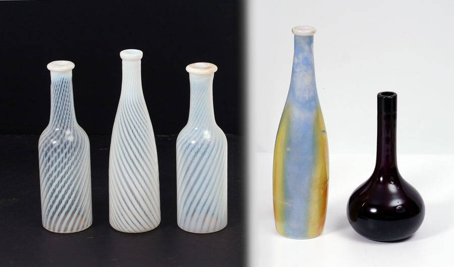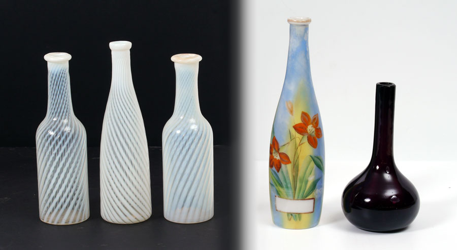 GROUP OF 5 BARBER BOTTLES: 3 white opalescent swirl, a deep amethyst glass and a painted milk glass bottle with worn paint, 10''. From the William Merner Collection.