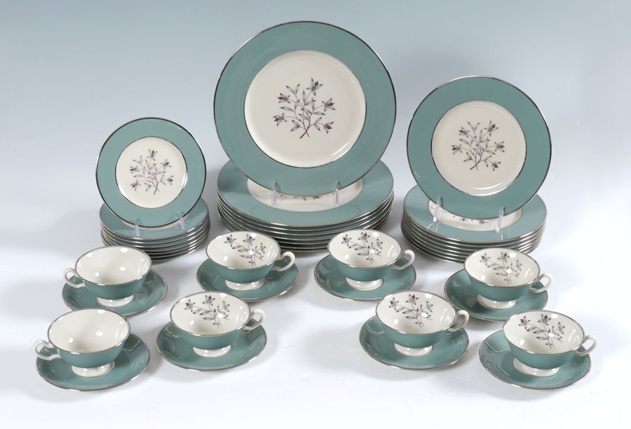 LENOX CHINA IN THE KINGSLEY X445 PATTERN: Service for 8, 40 pieces in the Kinglsey pattern by Lenox to include 8 dinner plates (10 1/2''), 8 salad plates, 8 bread plates, 8 cups and 8 saucers.