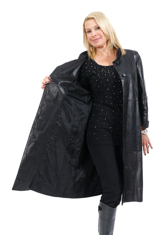 BLACK LEATHER FULL LENGTH COAT: Small to medium size, belt tie, patterned band at shoulders, cuffs and collar. 42''l., 22'' sleeves, 17'' shoulders.