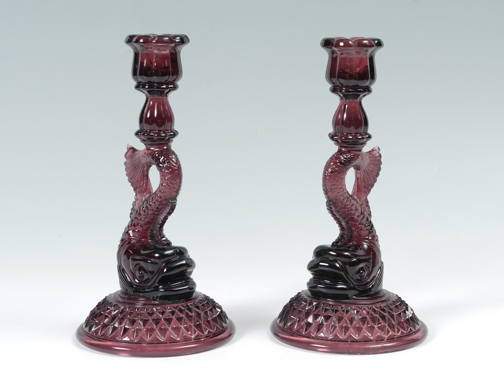 PAIR AMETHYST GLASS DOLPHIN CANDLESTICKS: Pressed amethyst glass in the form of figural dolphins, each 9 1/2'' h. x 5'' dia.