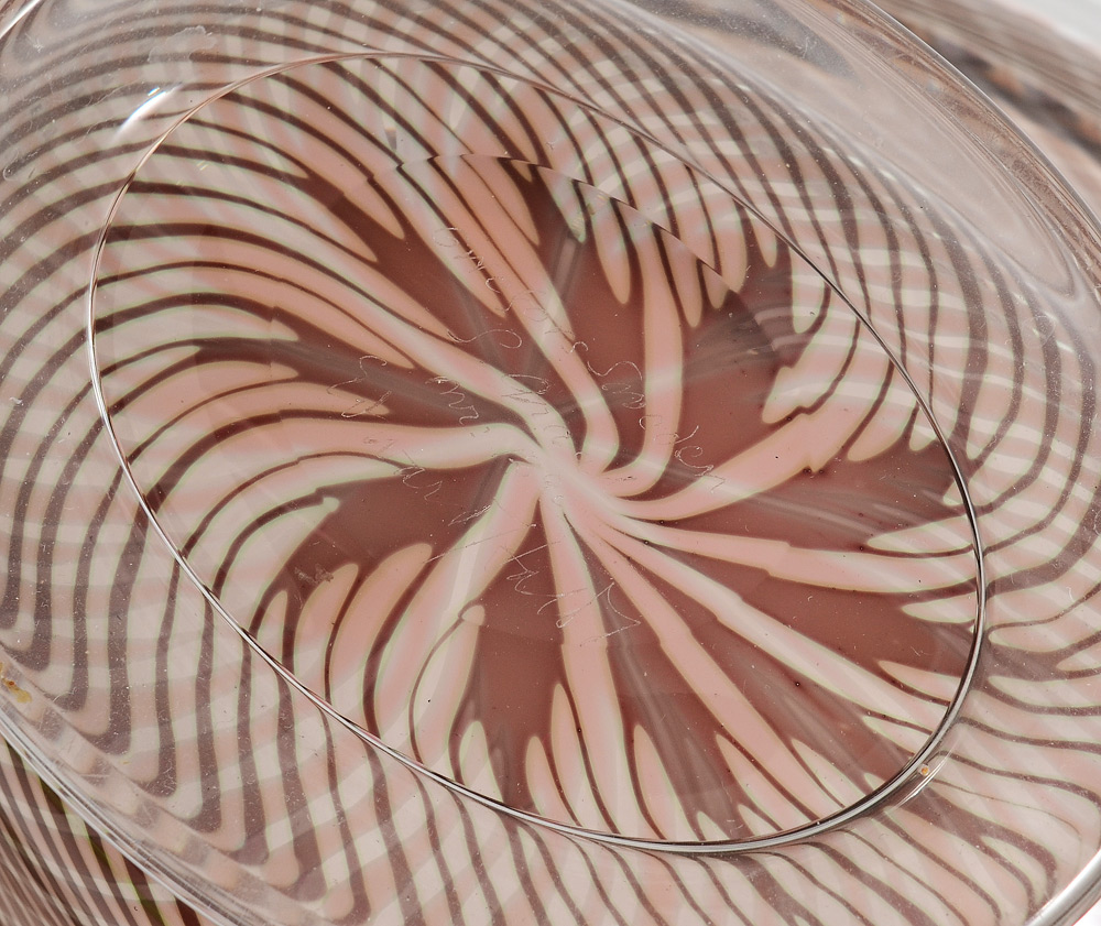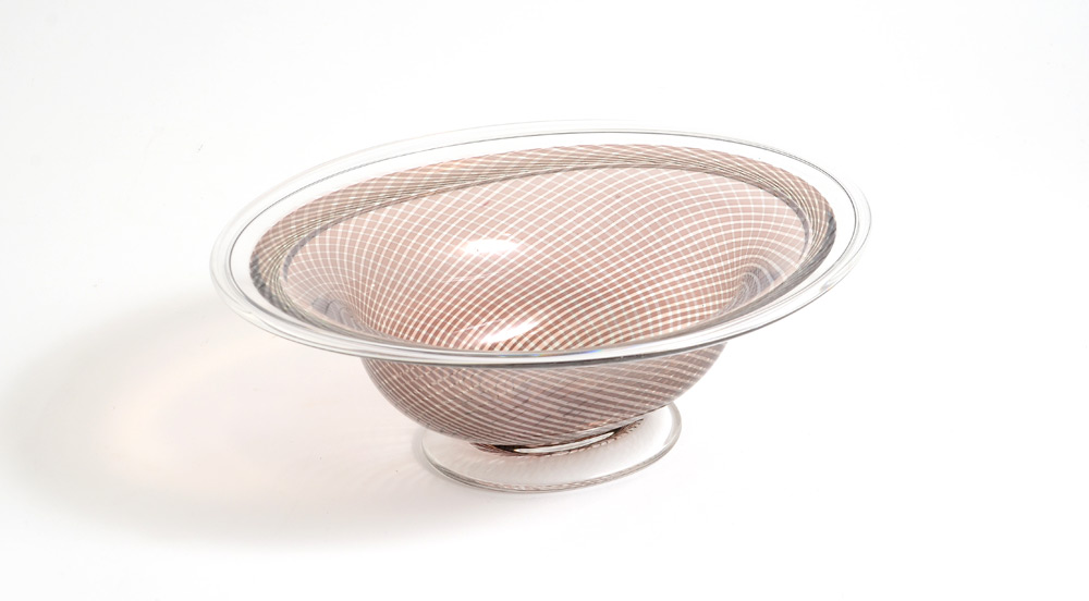 ORREFORS FOOTED SERVING BOWL: Oval bowl with lattice design, etched on base Orrefors Sweden, S. Graal, mr 1296, and illegible. Measures 4'' h. x 11 3/4'' x 9 3/8''.