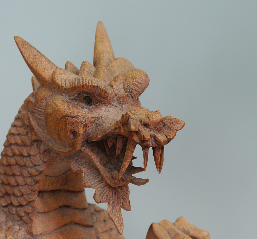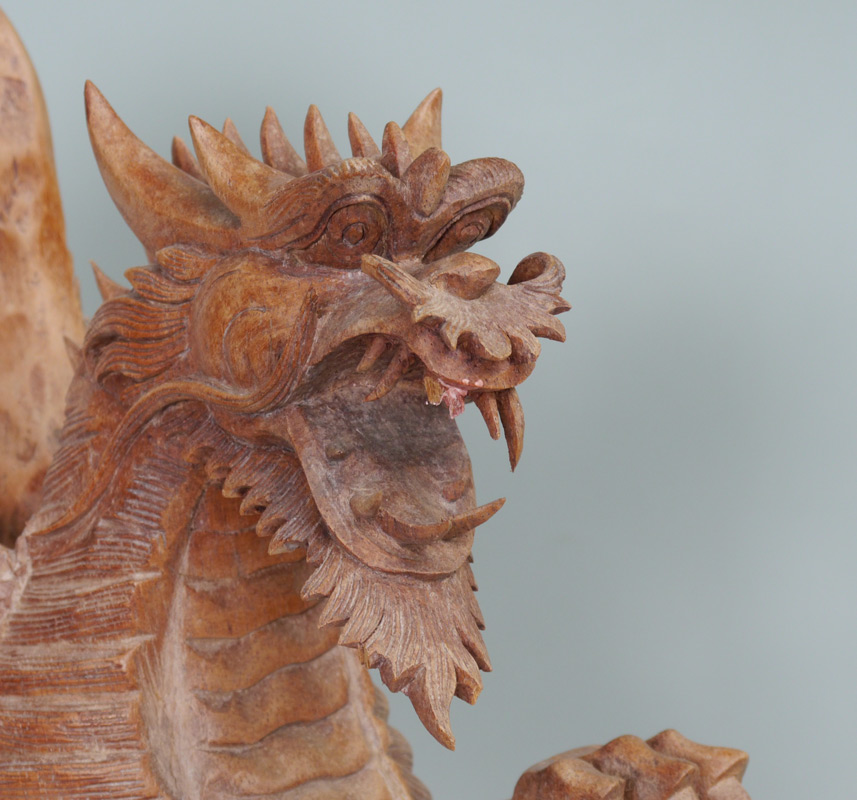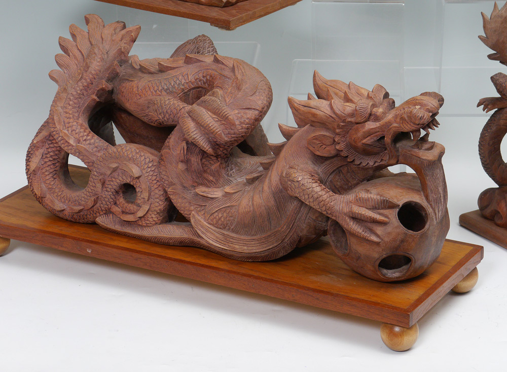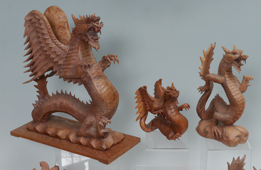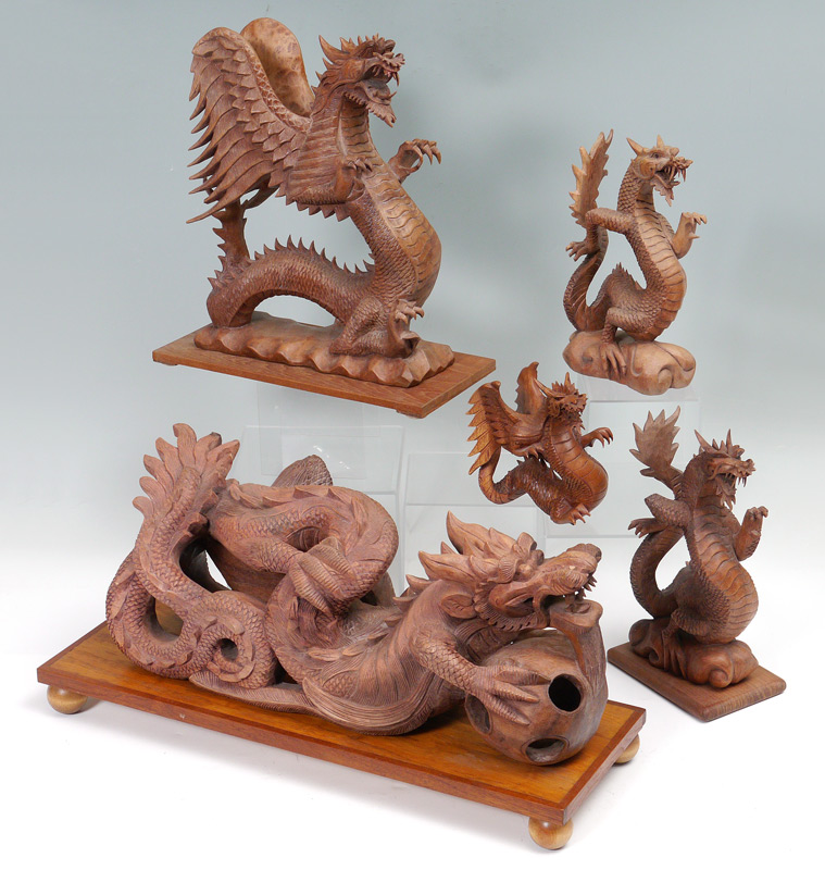 COLLECTION OF 5 ORIENTAL CARVED WOOD DRAGONS: In various poses and sizes. 3 with wood bases. Largest measures 8 3/4'' h. x 24 1/2'' x 8 3/4''