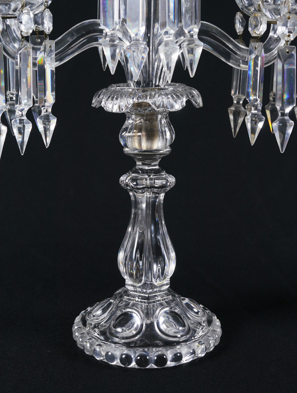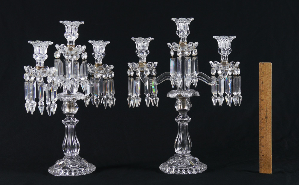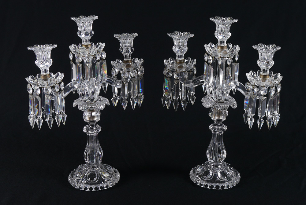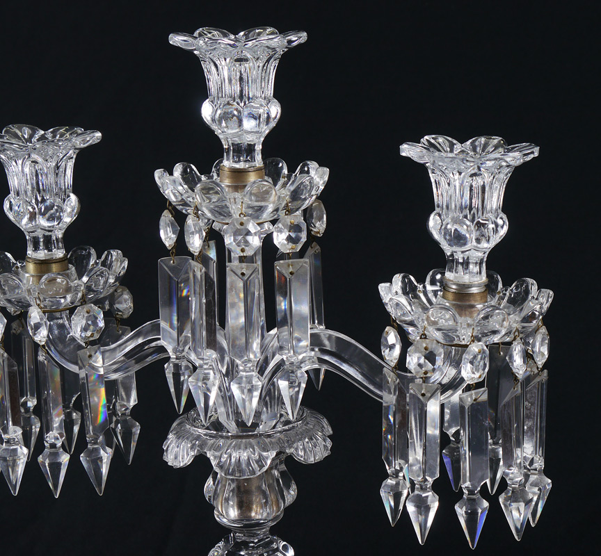 PAIR 3 LIGHT CRYSTAL CANDELABRA: Each with center light and 2 arms, drop prisms. Measure 17'' h. x 12 3/4'' x 5 3/4''.