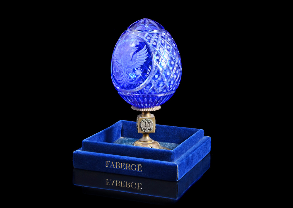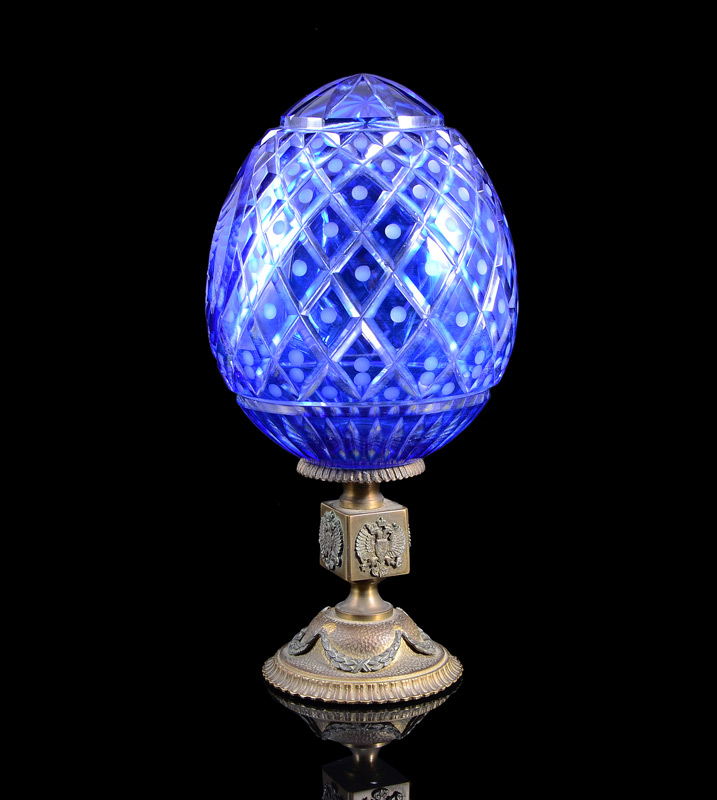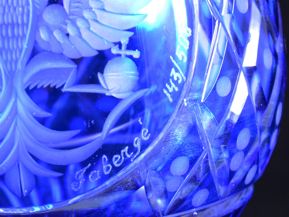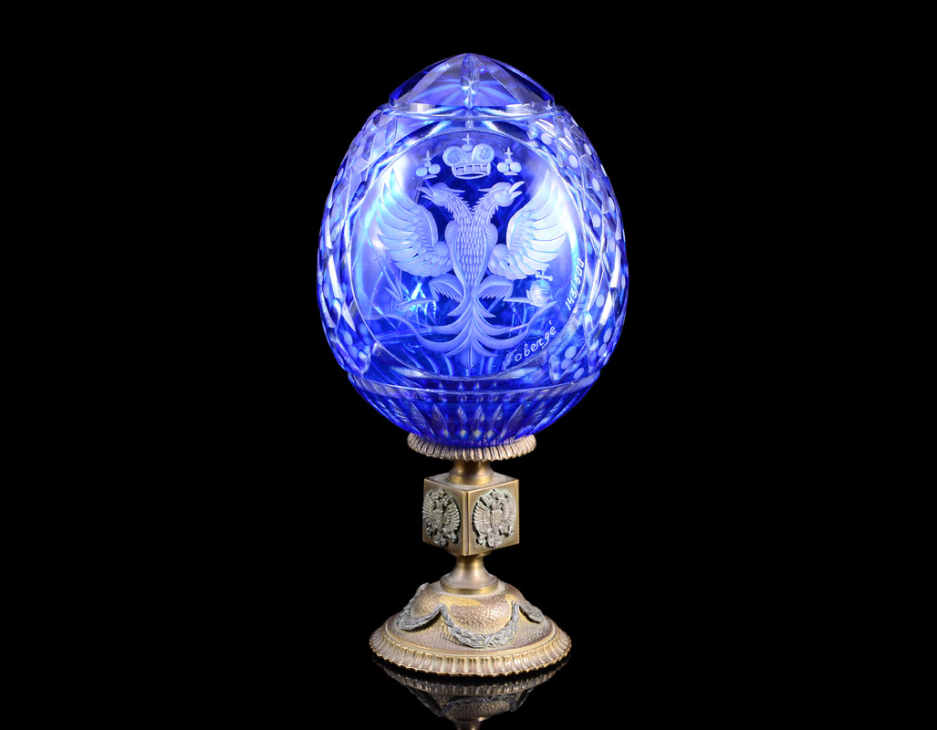 FABERGE COBALT CRYSTAL EGG: Faberge Renaissance Crystal Egg in cobalt cut to clear on bronze Romanov eagle stand. These collectable eggs are mouth blown in France and copper wheel engraved in St. Petersburg, Russia. Signed and numbered 143/500, approx. 6 3/4''h. overall. Retail for up to $500 each.