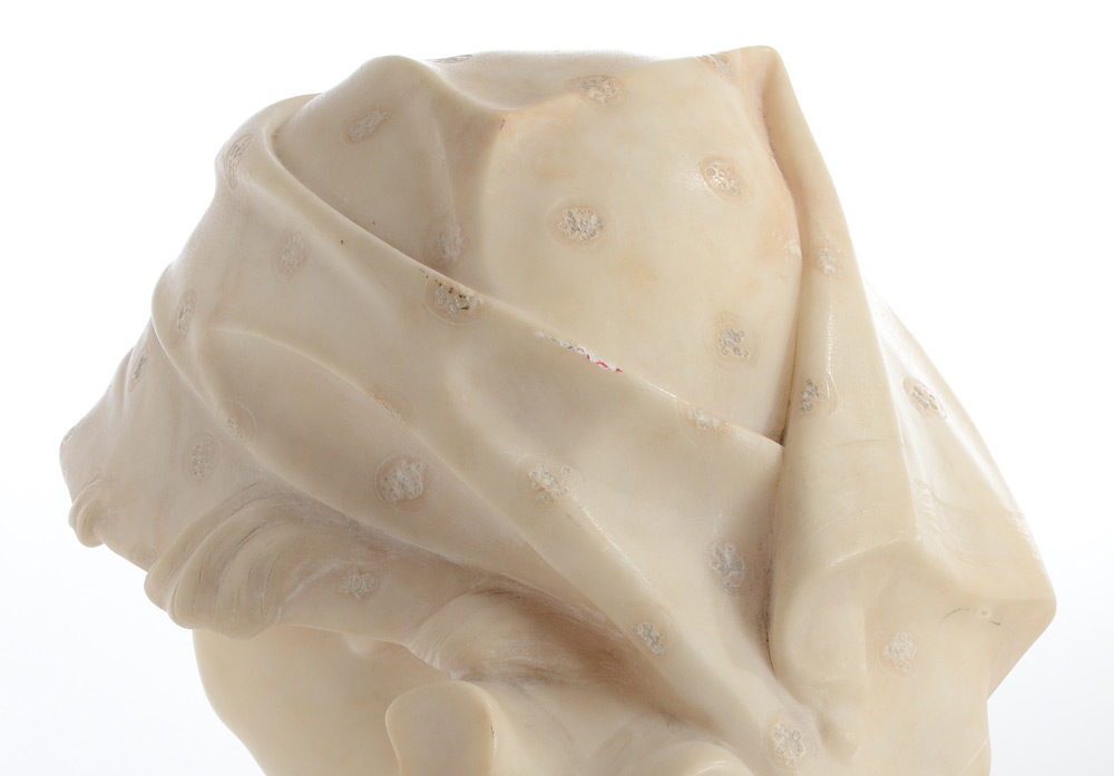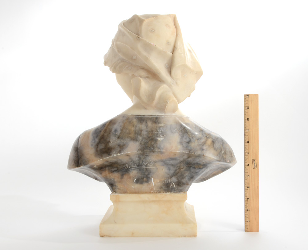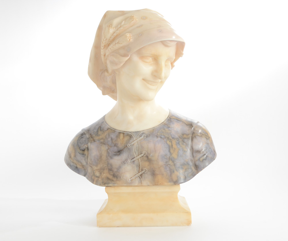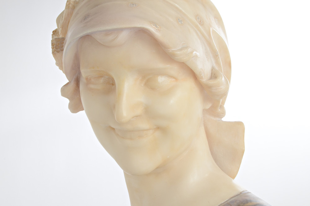 VITI, Giusto, (Italian, 19th Century): Alabaster & Marble Bust of a Smiling Maiden, 19 1/2'' h. with detachable plinth, 15'' w. x 8 '' d., incised signature verso.