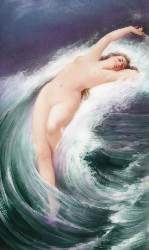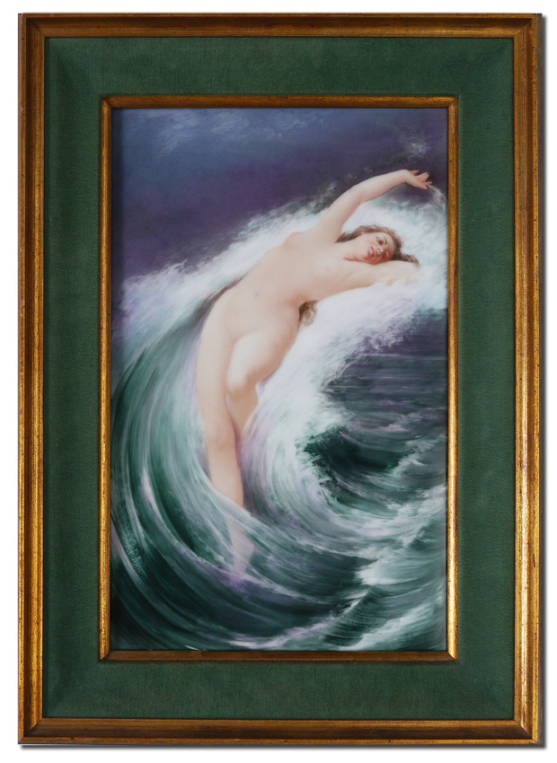 NOUVEAU NUDE PAINTED PORCELAIN PLAQUE: Scene Depicts a Nude Maiden being Swept Away by a Large Wave, Sight size approximately 13'' x 8'', no visible signature, impressed numerical markings verso, encased in a contemporary frame 17 3/4'' x 12 3/4''.