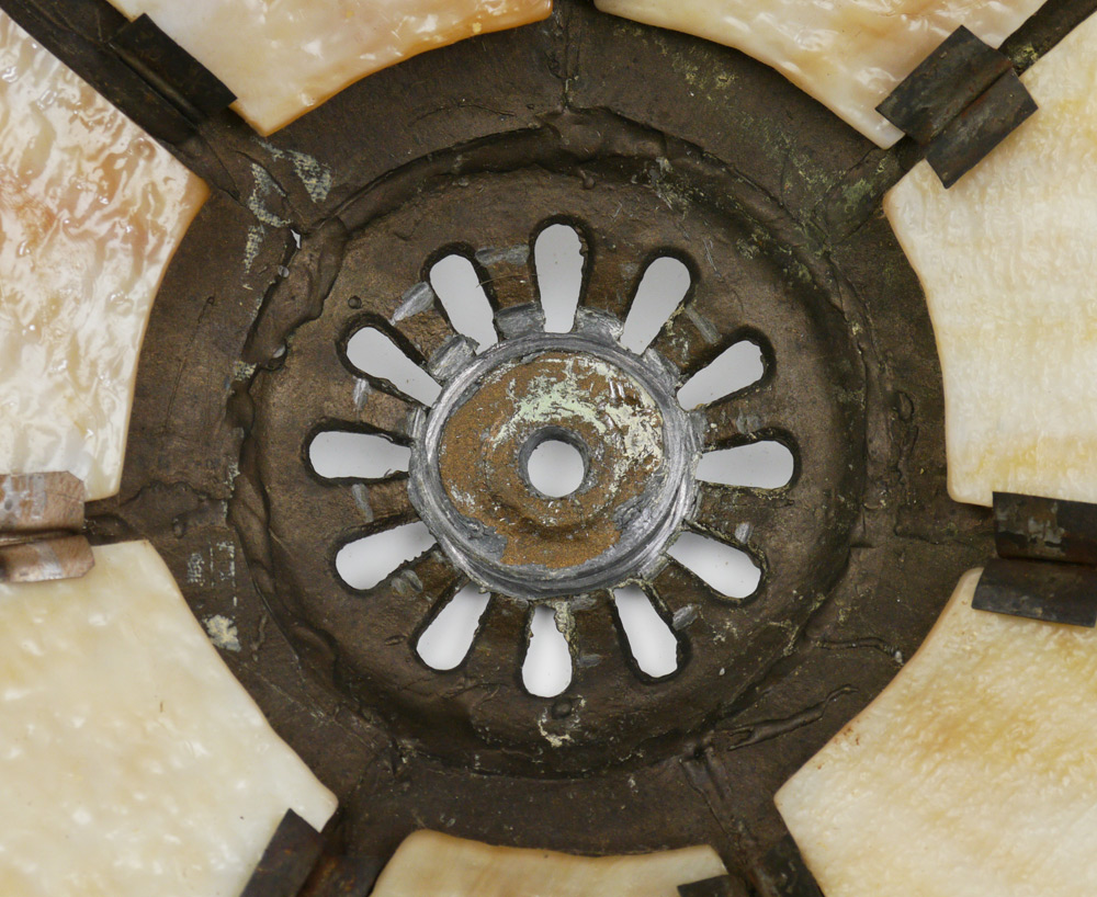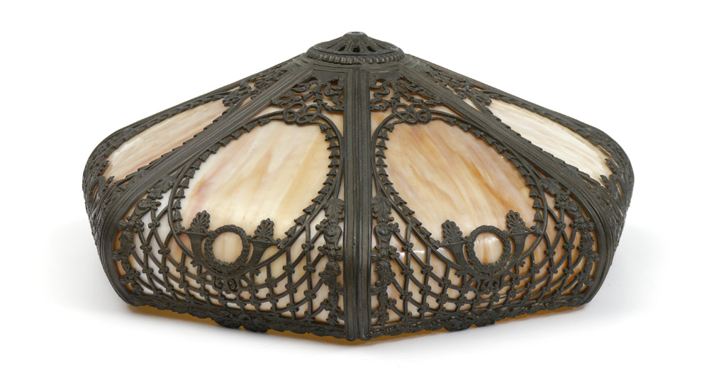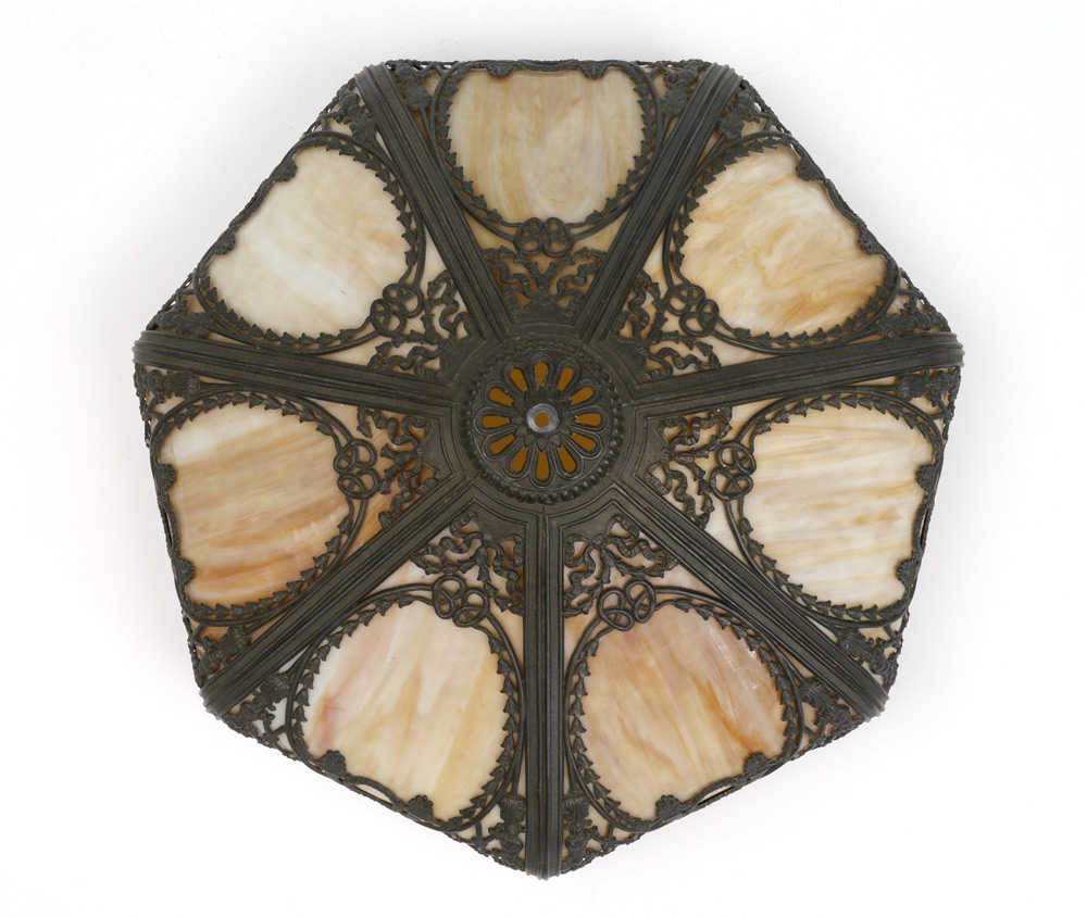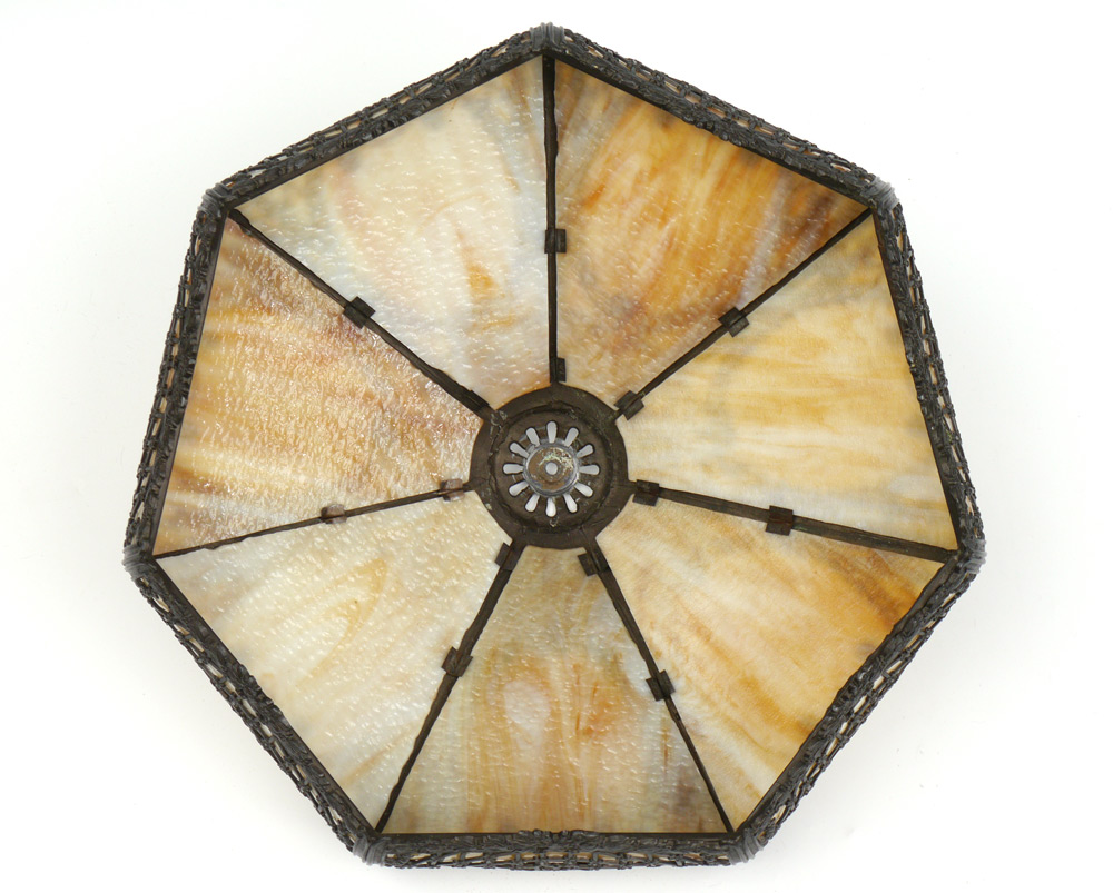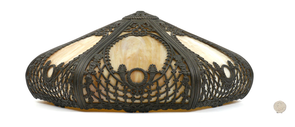 ORNATE 7 BENT PANEL SLAG GLASS LAMP SHADE: Detailed filigree frame over 7 caramel slag glass bent panels. Overall approx. 8 1/4'' x 21''