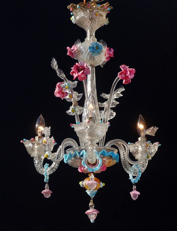 VENETIAN GLASS CHANDELIER: 3 light with twist glass arms, 8 additional decorative arms with applied floral decoration. 27 1/2'' h. x 18''