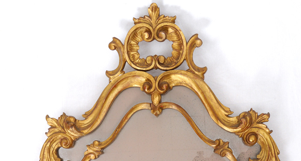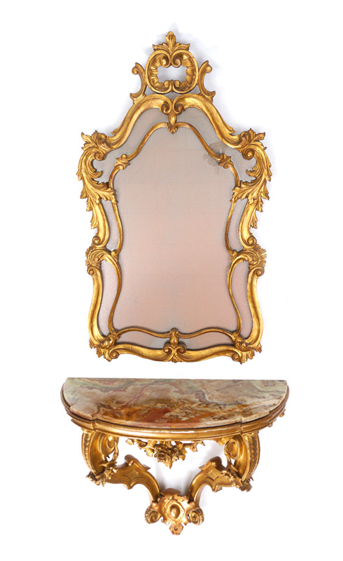 ITALIAN ONYX TOP DEMI TABLE WITH MIRROR: Carved and gilt wood set to include 1) Multi hued onyx top demi table, 25 1/2'' h. x 32 1/2'' x 13''. 2) Non-reflective mirror 43 1/4'' h. x 25 1/2'' x 12 1/2''