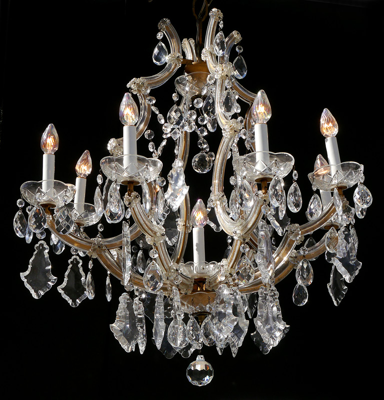 ITALIAN 8 LIGHT CHANDELIER: Bent arms encased in glass, prism chains, beveled and faceted drop prisms. The ceiling cap is impressed ''Made in Italy''. Measures approx. 26'' x 26'', excluding the chain.
