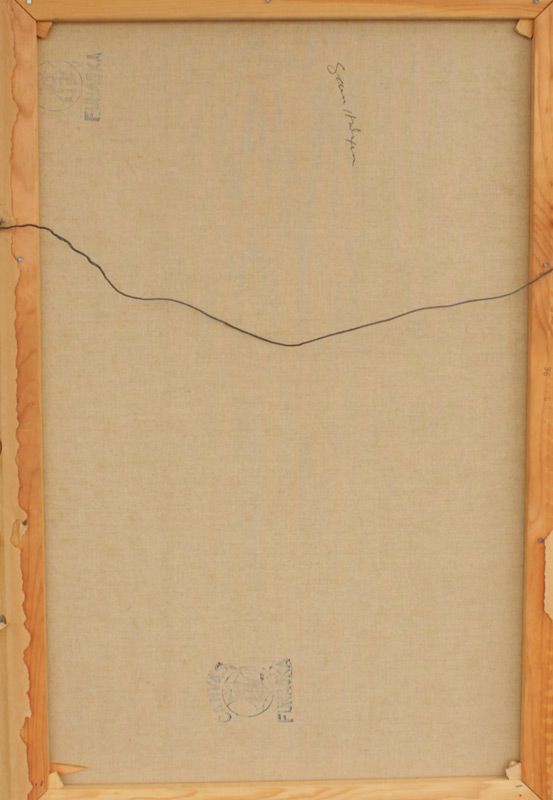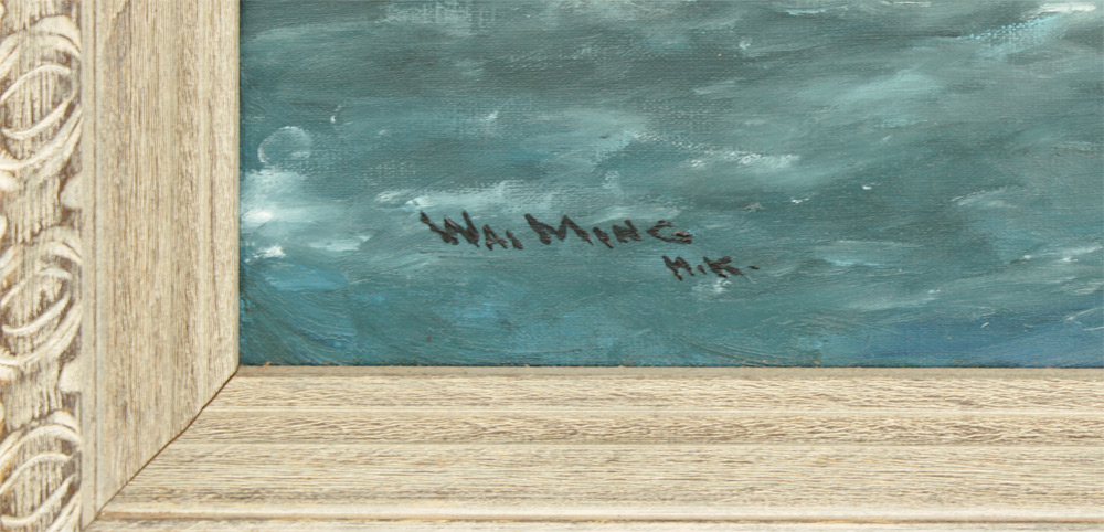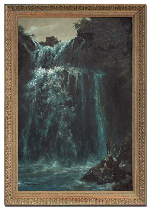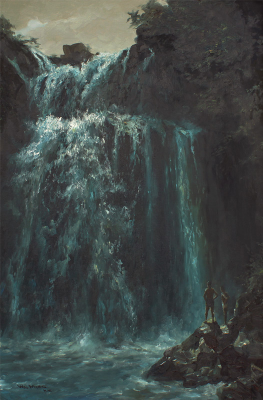 WAI, Ming, (Chinese, 1938): Two Figures Looking on a Tropical Waterfall, Oil/Canvas, 36'' x 24'', signed lower left, illegible inscription verso, encased in a carved and painted frame 40 1/2'' x 29''.