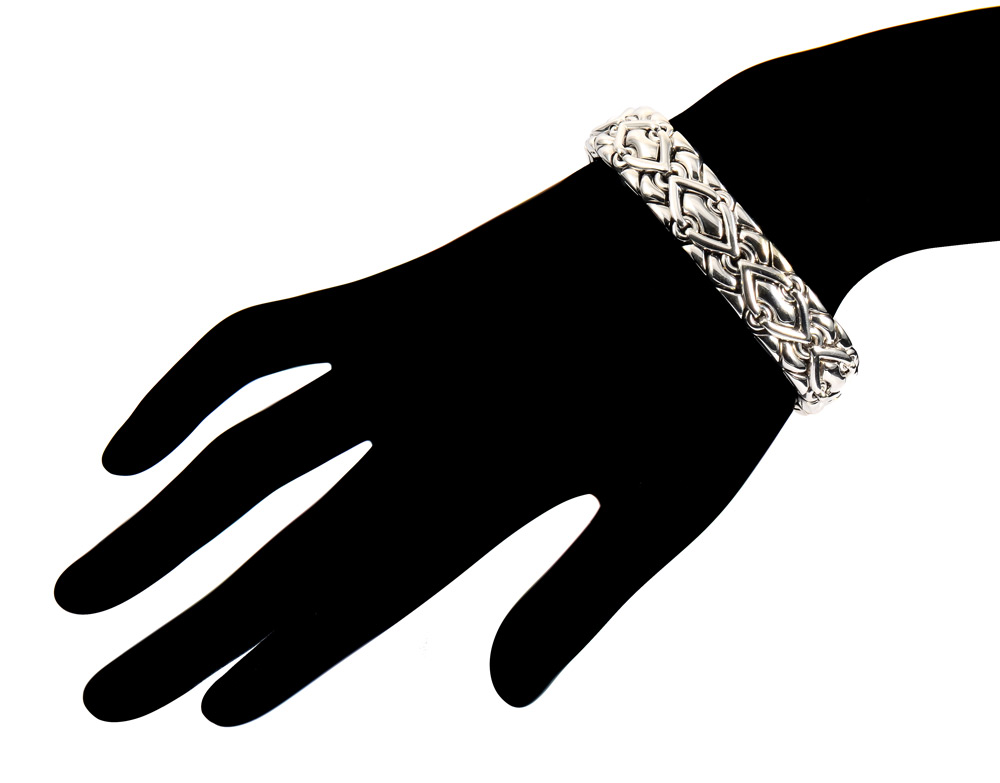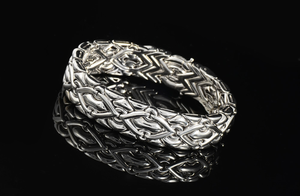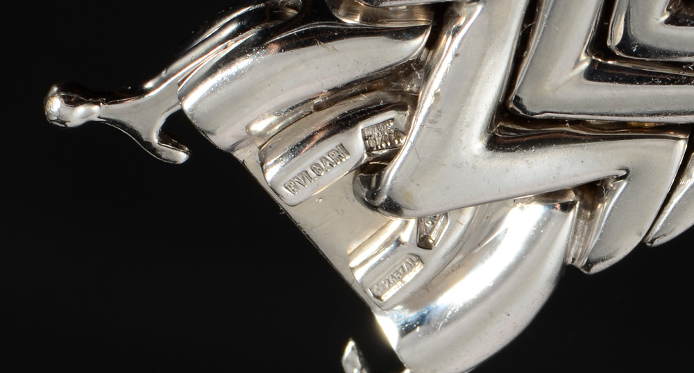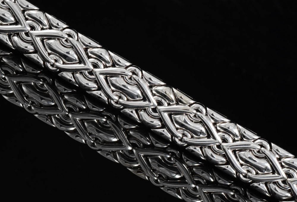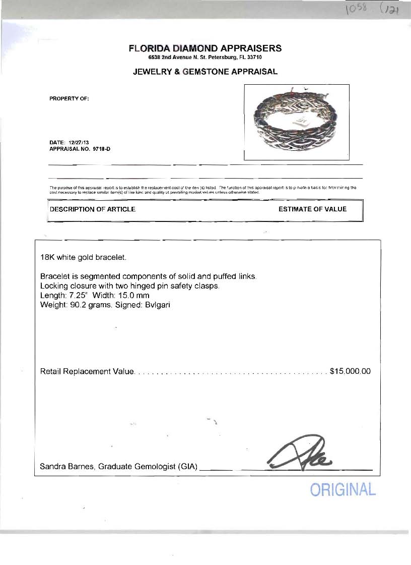 BVLGARI BRACELET IN 18K WHITE GOLD: A line bracelet of segmented solid and puffed links. Width 15mm. Length 7.25'' and weight is 90.2 grams. Signed Bvlgari. Sold with current Florida Diamond Appraisers GIA graduates appraisal for $15,000.