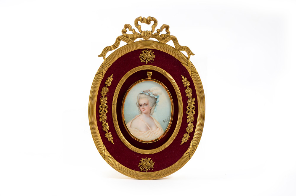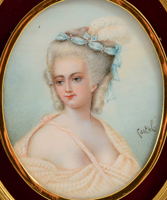MINIATURE WATERCOLOR PORTRAIT ON IVORY OF A YOUNG GIRL: 2 3/4'' x 2 1/8'', signed lower right Castel, oval metal frame with floral festoons 7 3/4'' x 5 1/2''.