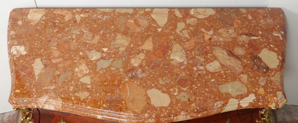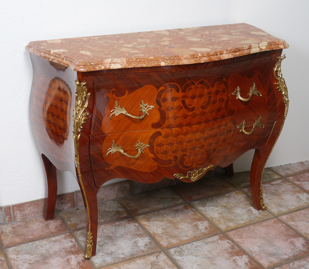 ITALIAN INLAID BOMBE 2 DRAWER STAND: Polished marble top, ormolu handles and decorations, parquetry inlaid front and sides, high gloss finish. Overall 33 1/4'' h. x 45 1/2'' x 19''