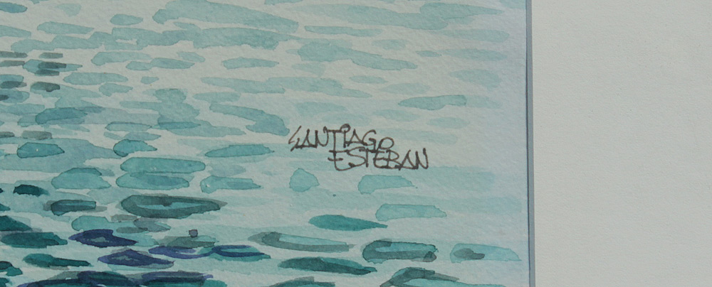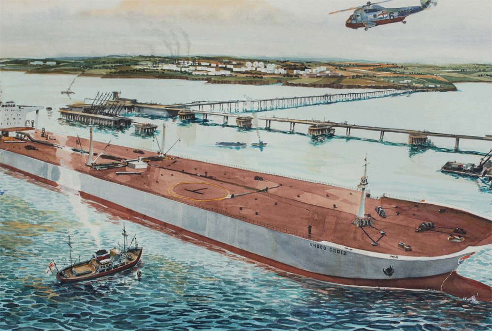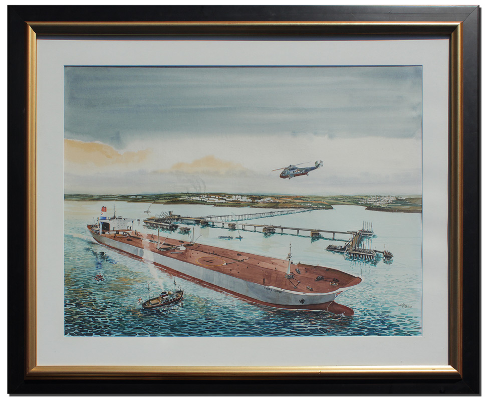 LARGE AMOCO TANKER CADIZ PAINTING BY SANTIAGO ESTEBAN: Watercolor, Sight size 26 1/2'' x 38'', signed lower right, encased in fine contemporary frame 38 1/2'' x 51'', reportedly from the Collection of a Former Amoco Executive.