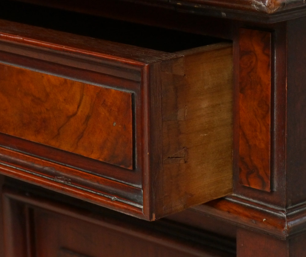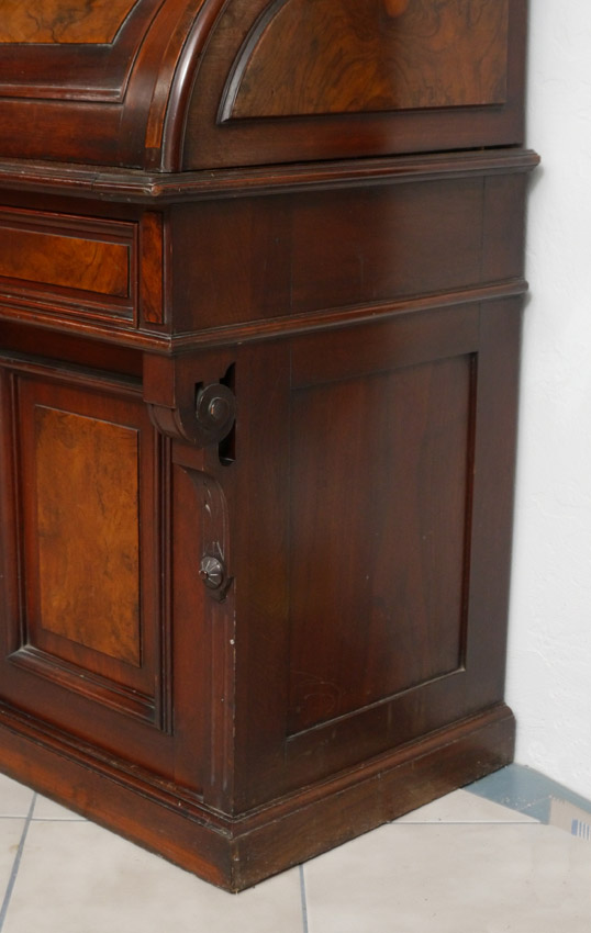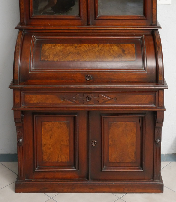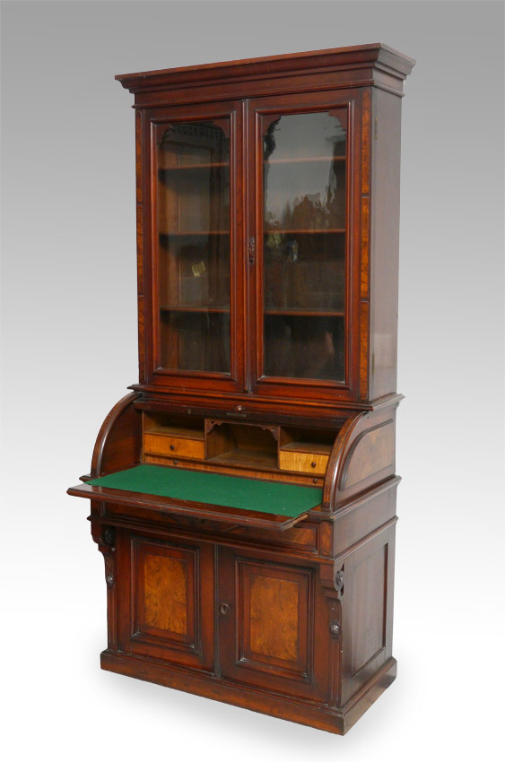VICTORIAN CYLINDER ROLL BOOK CASE SECRETARY: Top bookcase with 2 glass doors, 3 adjustable shelves. Cylinder roll base, interior with 2 drawers, shelves, slide out replacement felt writing surface. Single drawer over 2 doors. Overall measures 83'' h. x 37 1/2'' x 22 1/2''.