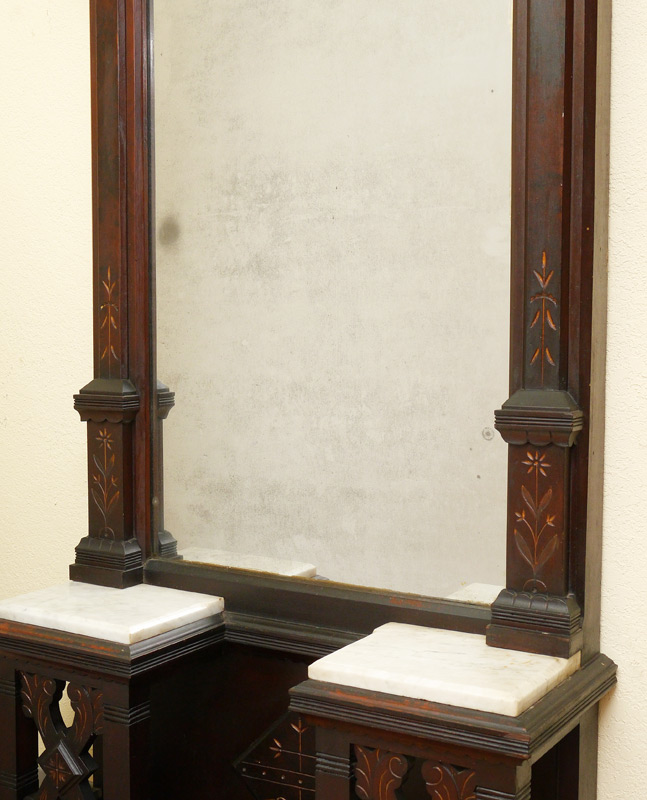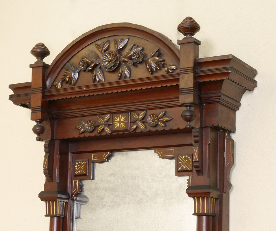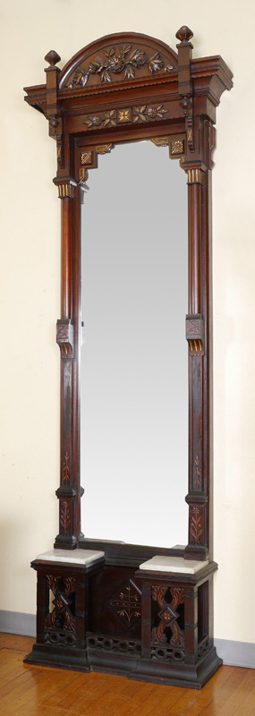 10 FT TALL VICTORIAN PIER MIRROR: Curved pediment with applied floral decoration, gilt accents. 3/4 column over carved stiles, base with carved decoration, 2 marble inserts for stands. Overall measures 107'' h. x 36 1/4'' x 12''.