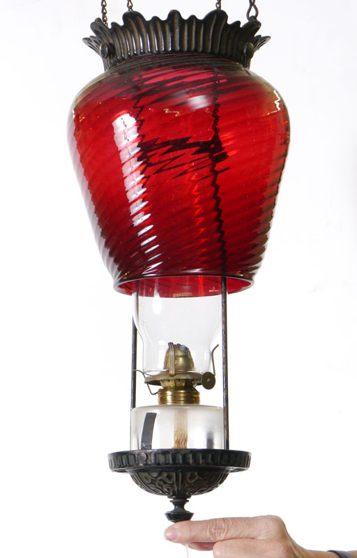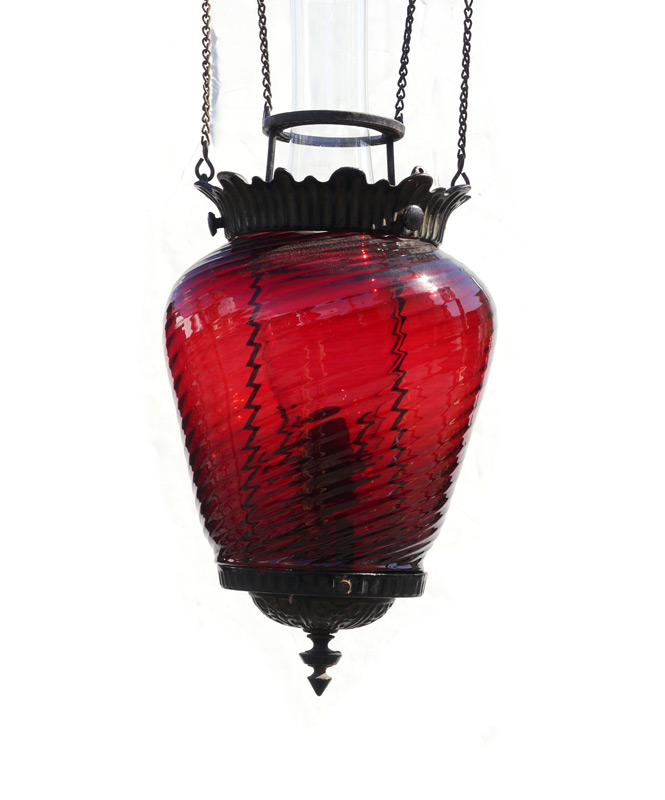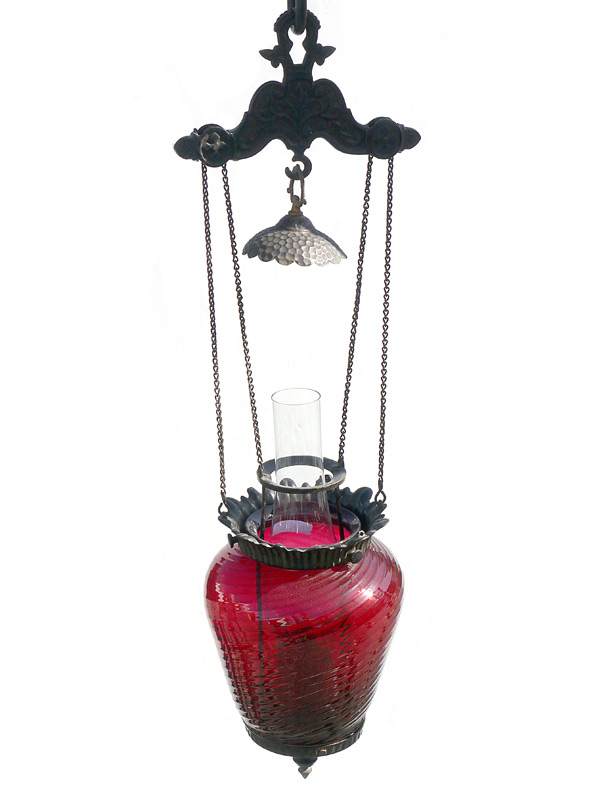 VICTORIAN ERA CRANBERRY GLASS HANGING OIL LAMP: Cranberry glass body with left twist. Cast iron hanger, all original. Overall body measures 13'' x 7''.