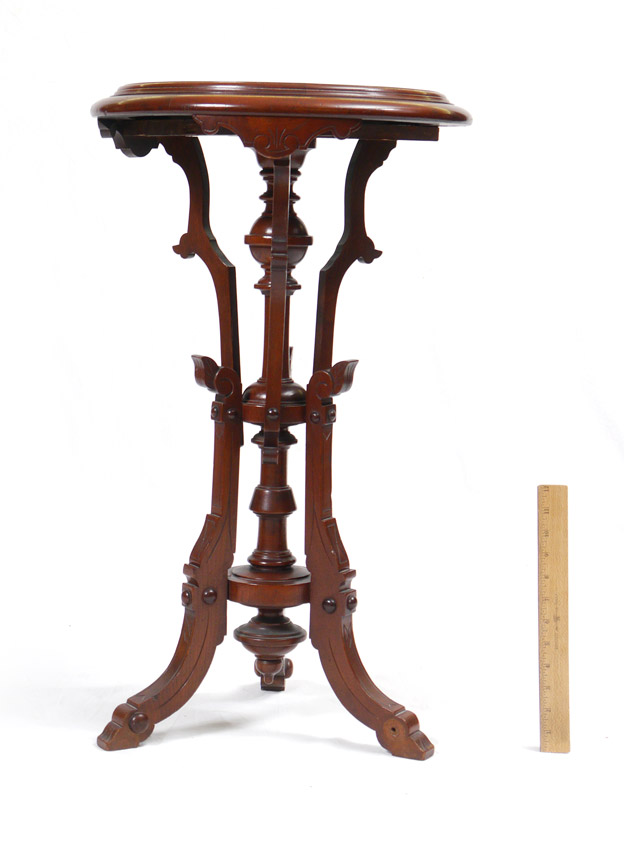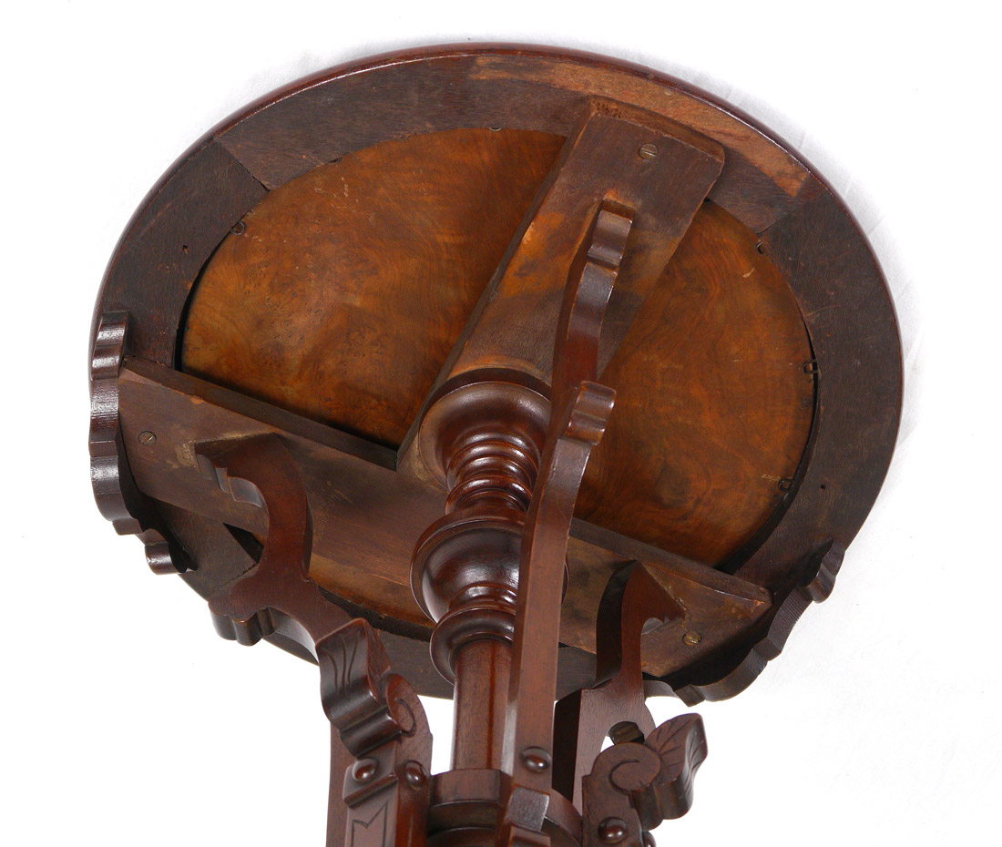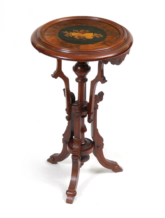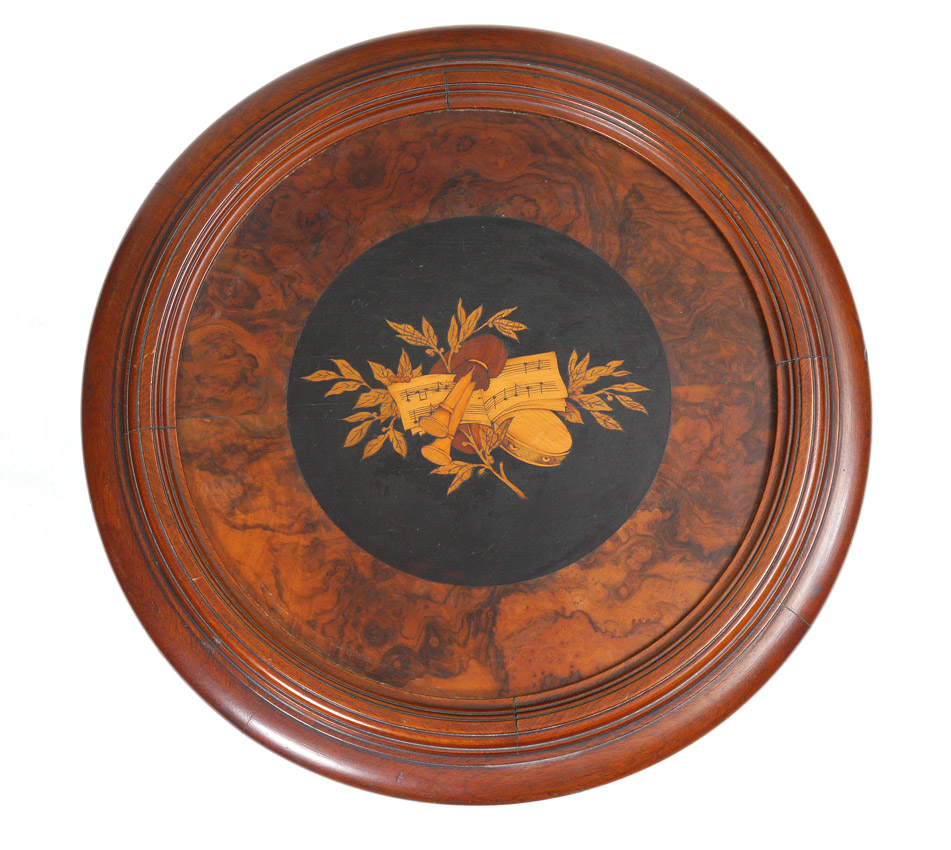MARQUETRY INLAID VICTORIAN WALNUT ROUND TOP TABLE: Top with marquetry inlaid musical instruments and sheet music, turned support, 3 carved splayed legs. 29 1/2'' h. x 17 1/4''.