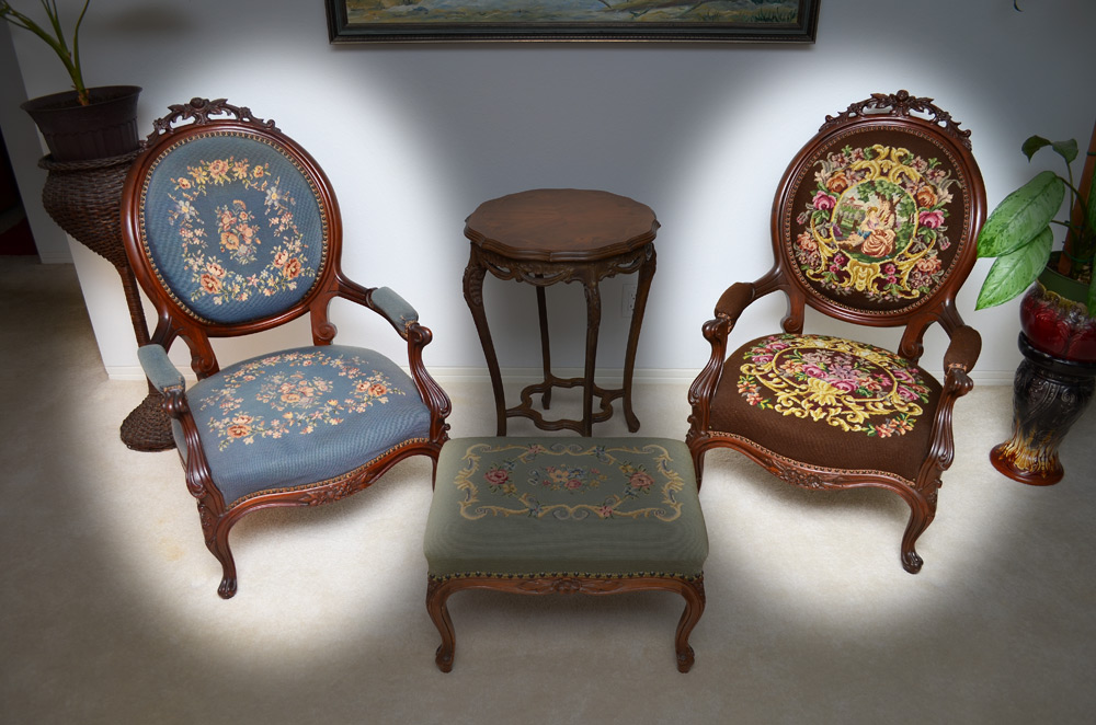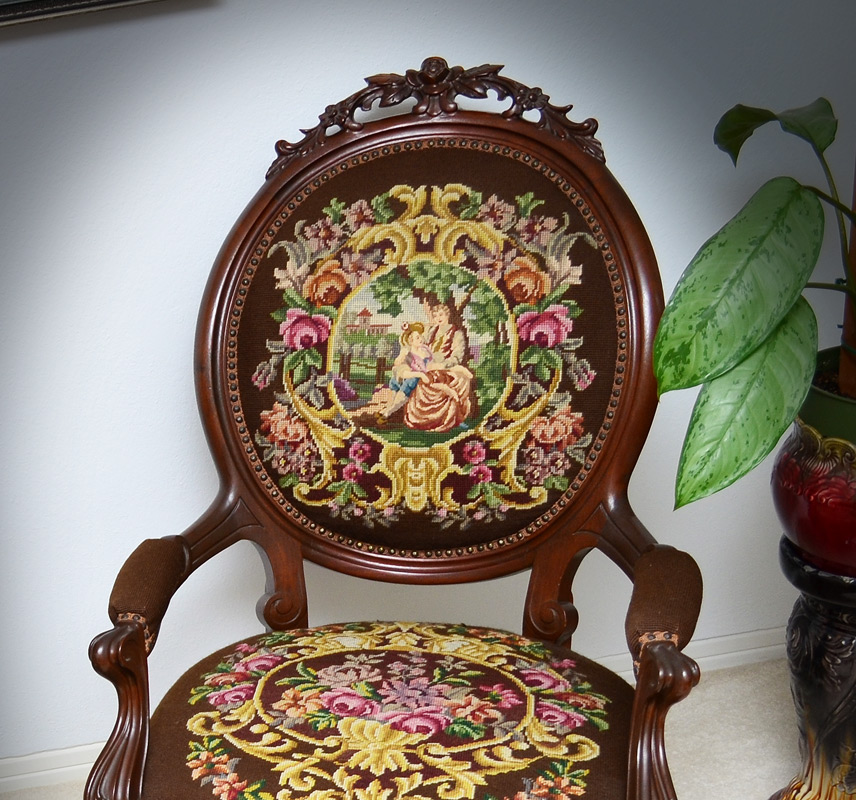 PAIR VICTORIAN ROCOCO NEEDLEPOINT PARLOR CHAIRS: Matching carved frames with foliate carved crests. One upholstered with outdoor genre scene and floral needlepoint on brown ground, the other with floral motifs on blue ground. 39 3/4'' h. x 24 1/4'' x 32''.