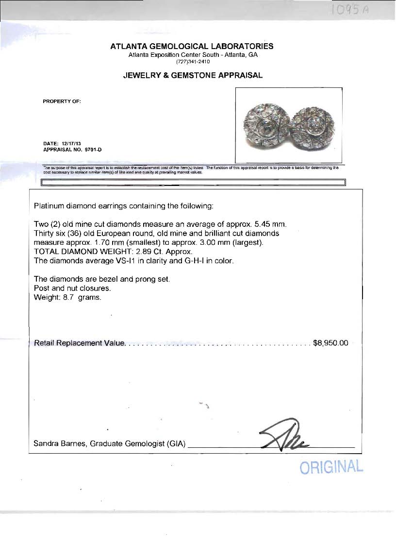 PLATINUM DIAMOND DOME EARRINGS: Filigree domes centering 2 mine cut diamonds and 36 old Euro, old mine and brilliant cut diamonds all totaling approx. 2.89 Ct. averaging VS-I1 clarity and G-H-I color. Post and nut closure. Diameter 15 mm. Weight 8.7 grams. Sold with current Atlanta Gemological GIA graduate's appraisal for $8,950.