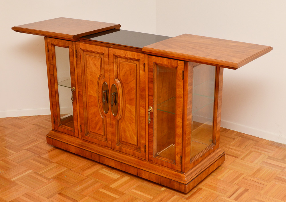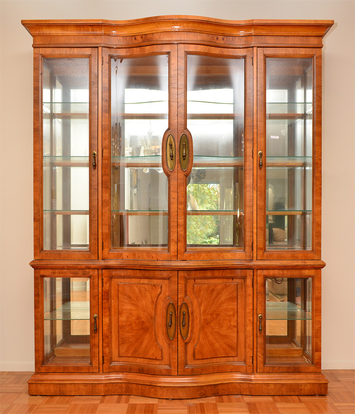 SERPENTINE CHINA CABINET WITH MATCHING SERVER: Manufactured by American of Martinsville to include 1) China cabinet, top with 4 glass doors, illuminated interior with 3 glass shelves. Base with 2 center doors with interior drawer and 2 glass doors display sections with glass sides. Overall 80 1/4'' h. x 64'' x 16''. 2) Server with sliding top over 2 central doors with interior drawer and shelf, 2 glass doors display sections with glass sides. 31'' h. x 44'' x 18''.