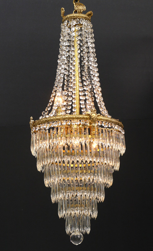 5 LIGHT BRASS & CRYSTAL CHANDELIER: Brass frame with garland swags over 6 cascading levels of drop prisms, lower faceted ball finial. 5 socket fixture. Approx. 38'' h. x 14''.