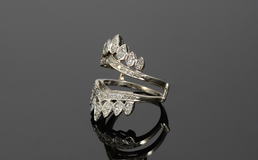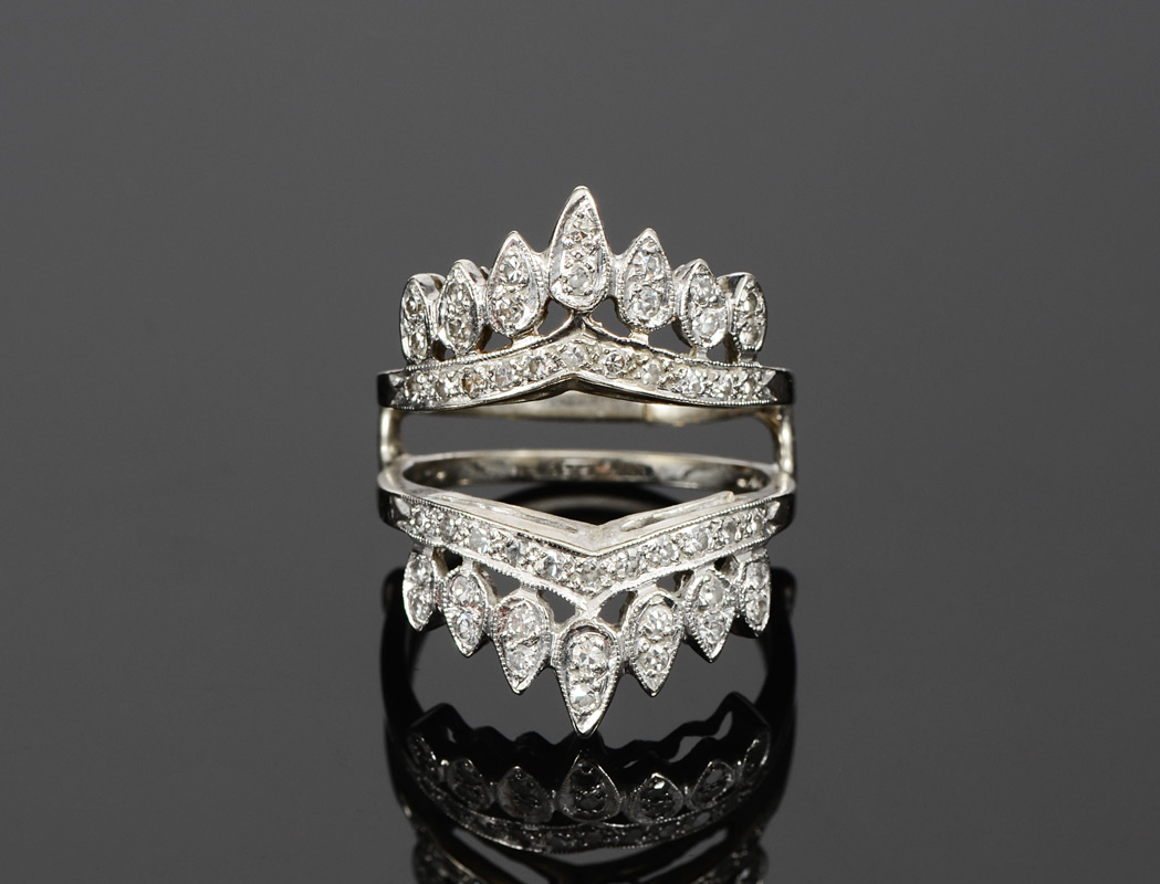 14K WHITE GOLD & DIAMOND RING JACKET: As per 1994 Jim Green Jewelers, Crystal River Florida Appraisal... ''Ladies 14k white gold diamond ring guard containing (50) single cut round diamonds weighing .50 cts diamonds are VS1/G clarity and color''. Size 8. Weight 6.5 grams. This an estate item being sold at no reserve.