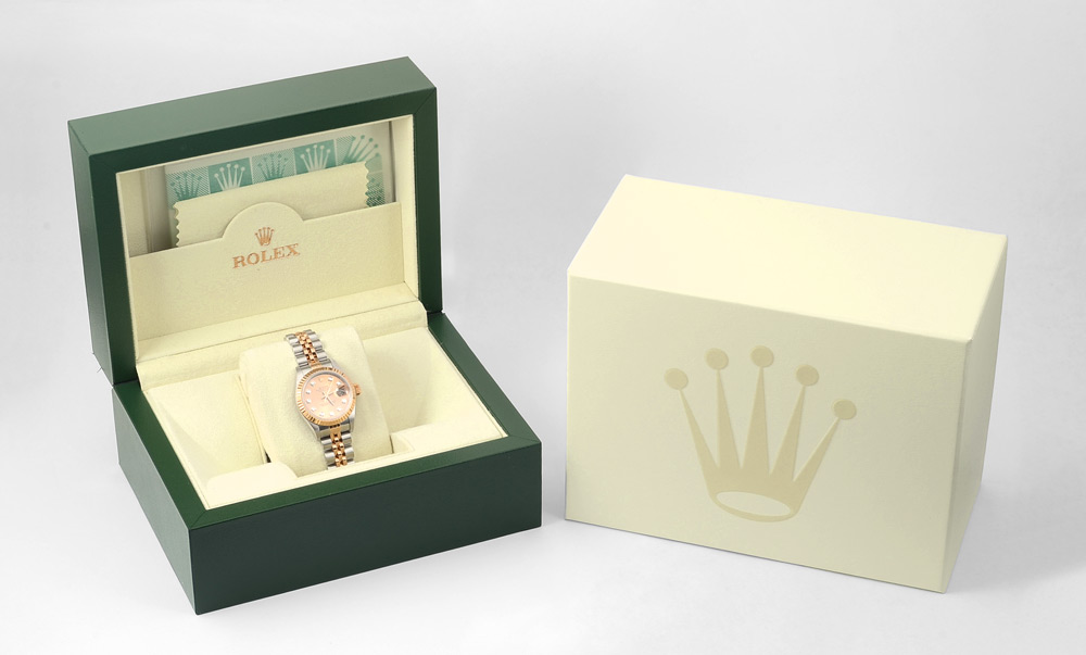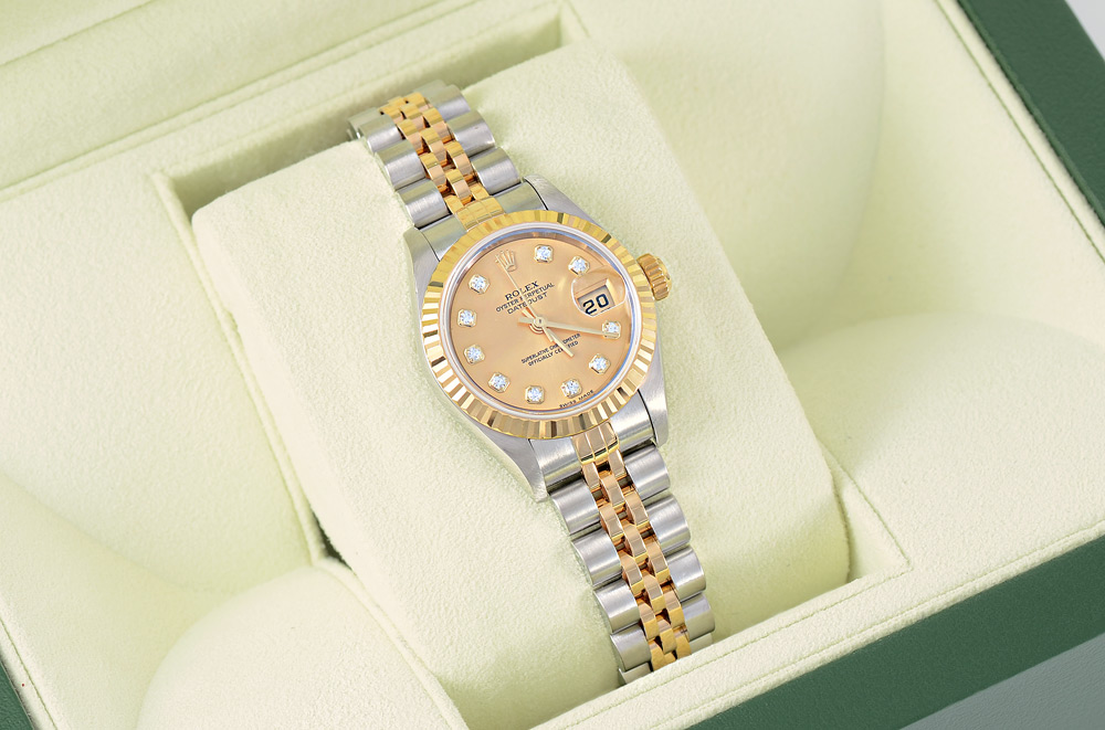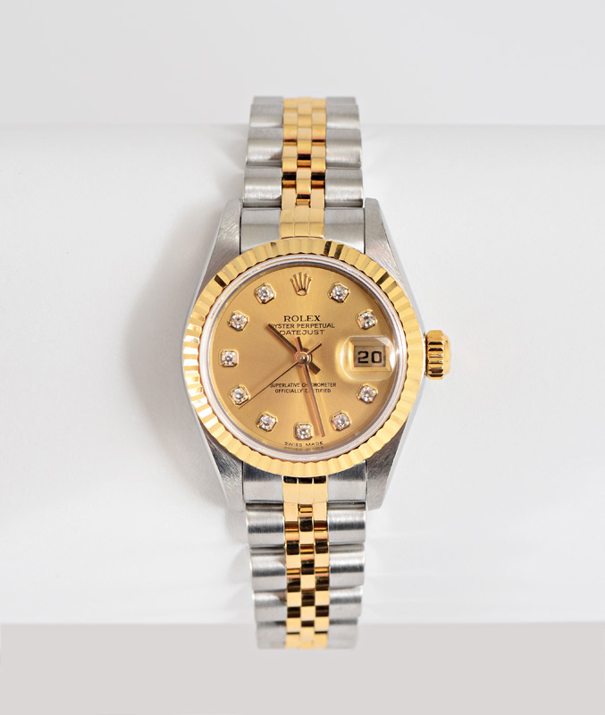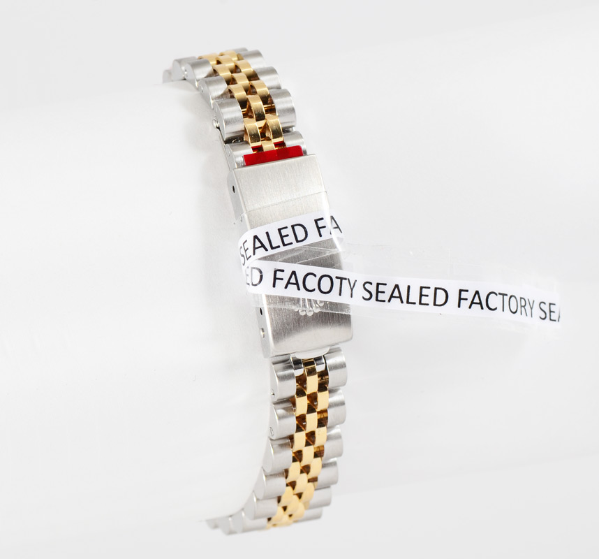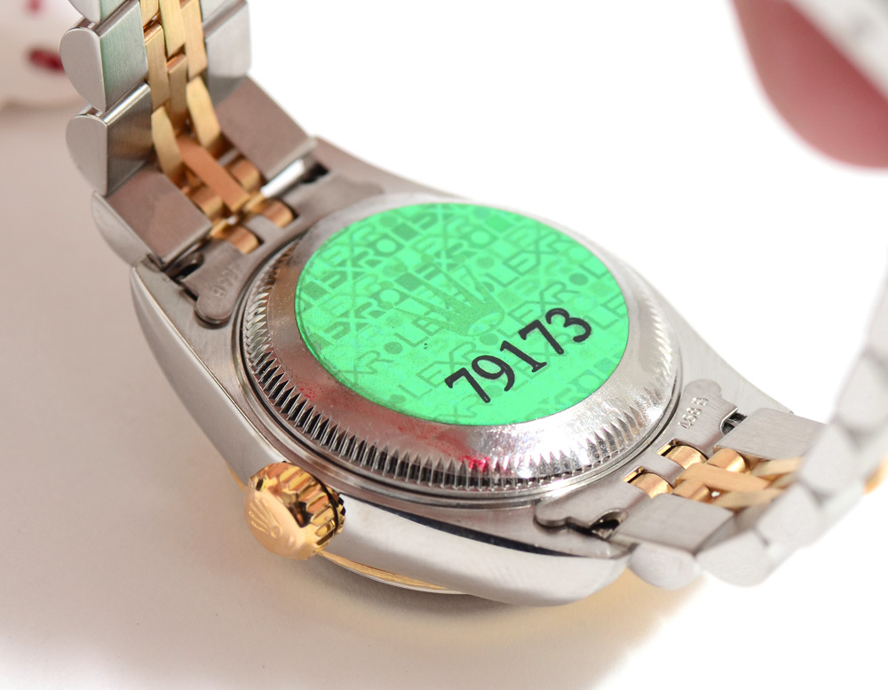 ROLEX DATEJUST TWO TONE 18K GOLD & STAINLESS LADIES WATCH: Never worn slider with the factory red seal intact. Model 79173, serial K477089. Champagne dial with factory diamond markers. Oyster perpetual chronograph. Ca. 2002/2003. Sold in the box with certificate.