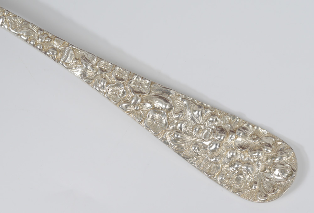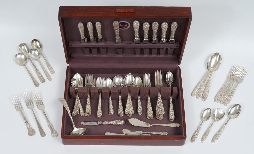 STIEFF ROSE STERLING SILVER FLATWARE SERVICE: Approx. 63 pieces in the Stieff Rose pattern to include 11 forks (6 7/8''), 11 salad forks (6''), 13 teaspoons (6''), 4 soup spoons (6''), 3 iced tea spoons (7 1/2''), 3 - 5 o'clock teaspoons (5 5/8''), 9 hollow handle knives of varying lengths, hollow butter knife (6''), solid master butter (7 1/4''), 2 solid butter knives (6''), cream ladle (6 1/4''), sugar scoop (6''), jelly server (6 1/4''), small pierced bowl serving spoon (5 3/4''), cocktail fork (6''). Stieff Rose service monogrammed. Sold with an additional 9 pieces in Manchester Silver ''Southern Rose'' pattern and 7 other assorted pieces. Sold with wood silver chest, 3 1/2'' h. x 16'' x 11 3/4''. Approx. 93.3 troy oz overall.