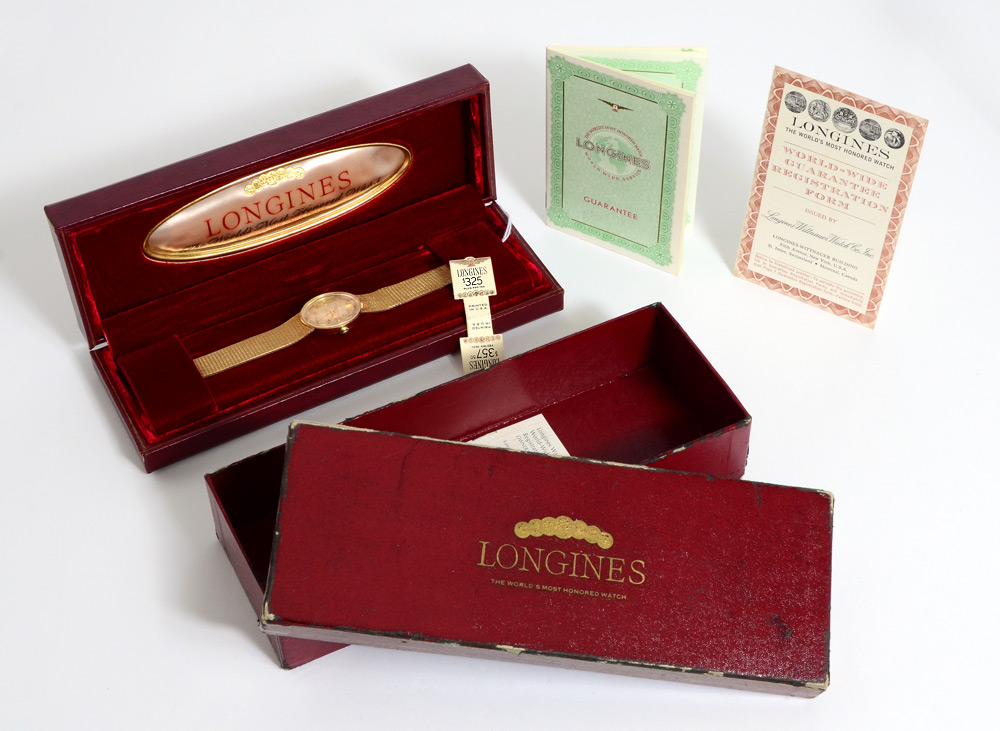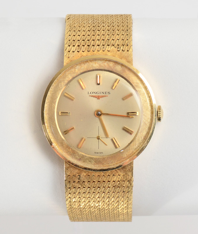 14K GOLD LONGINES CREATION M1904 MAN'S WATCH: 14K woven mesh band. Movement # V12942311. Original velvet lined box and bill of sale. Purchased 3/13/65.